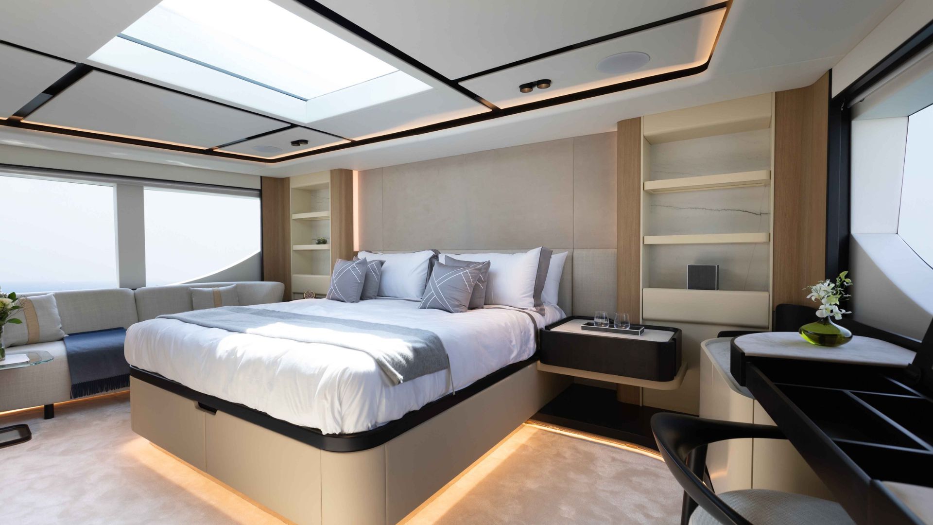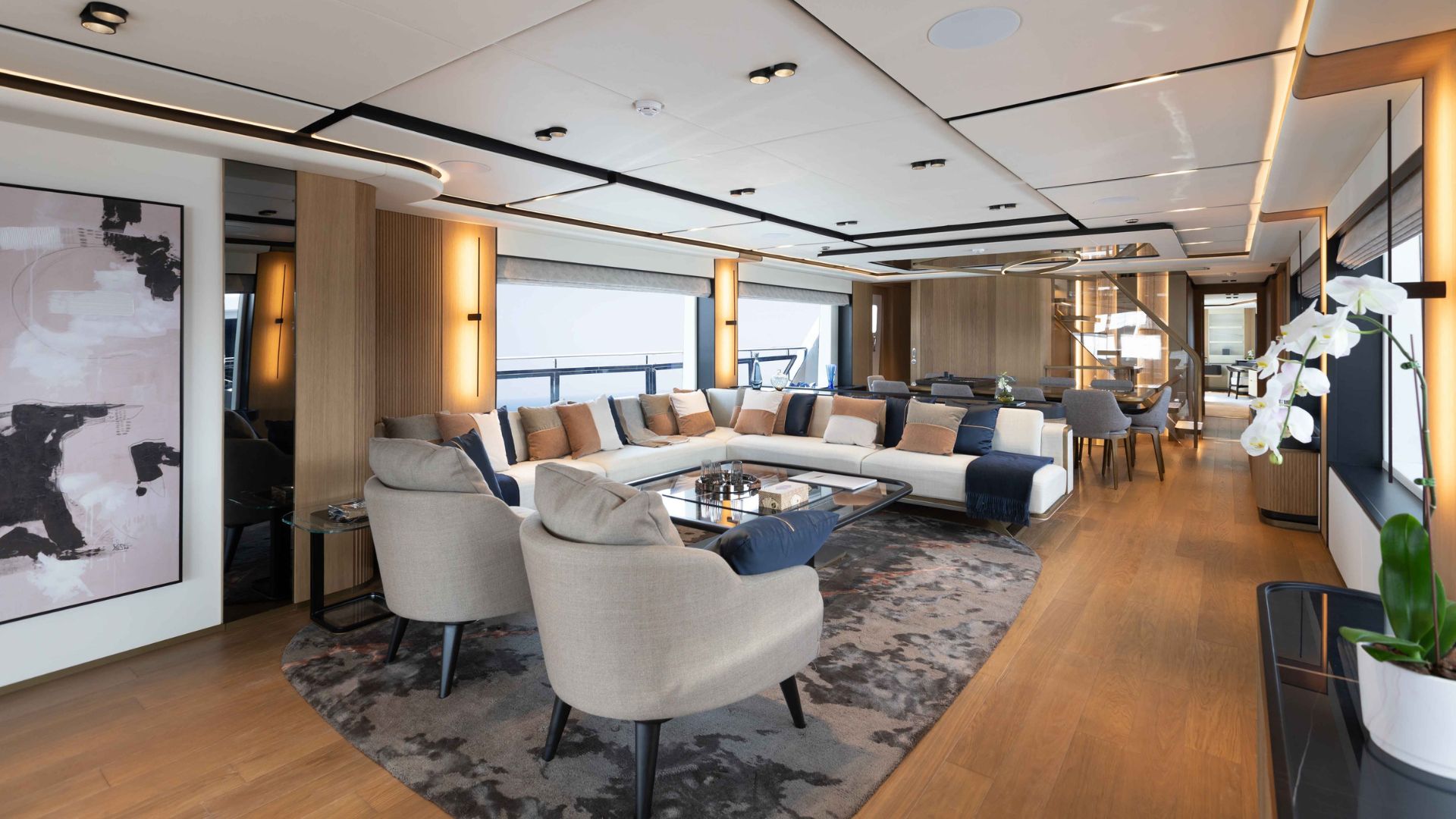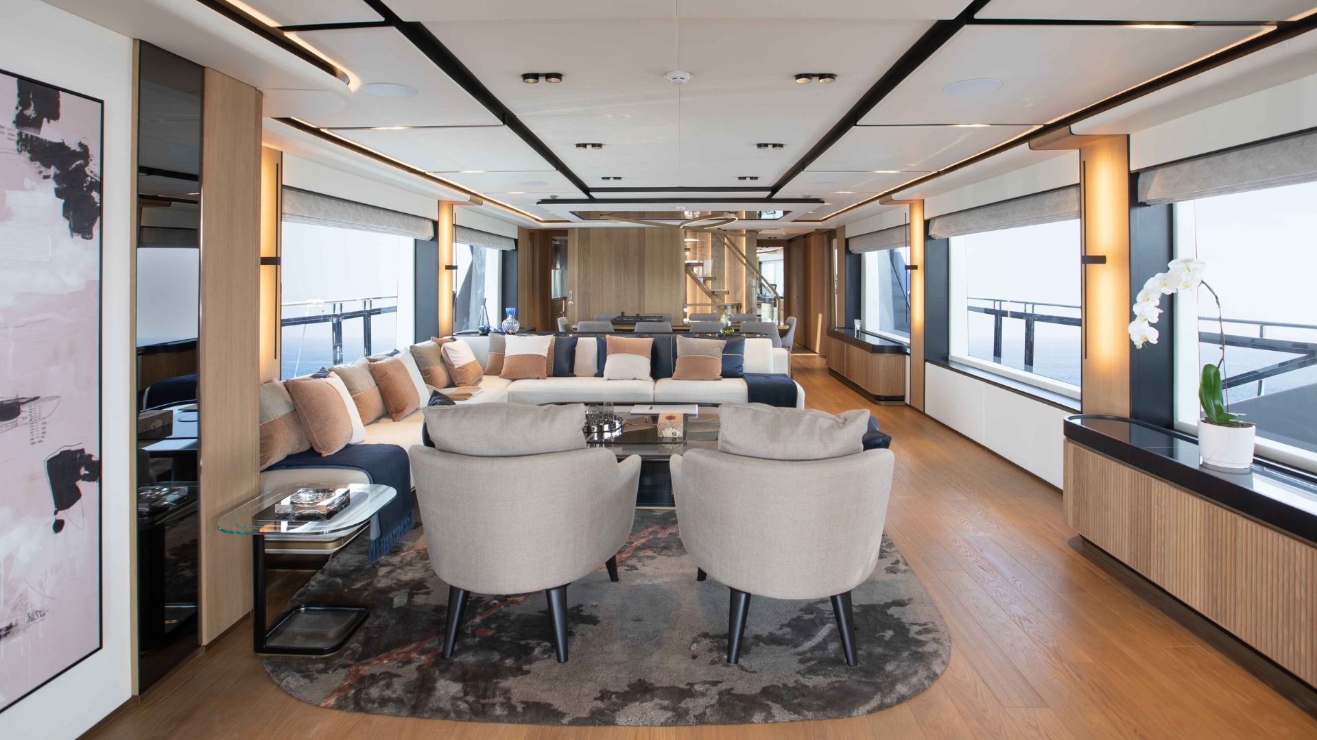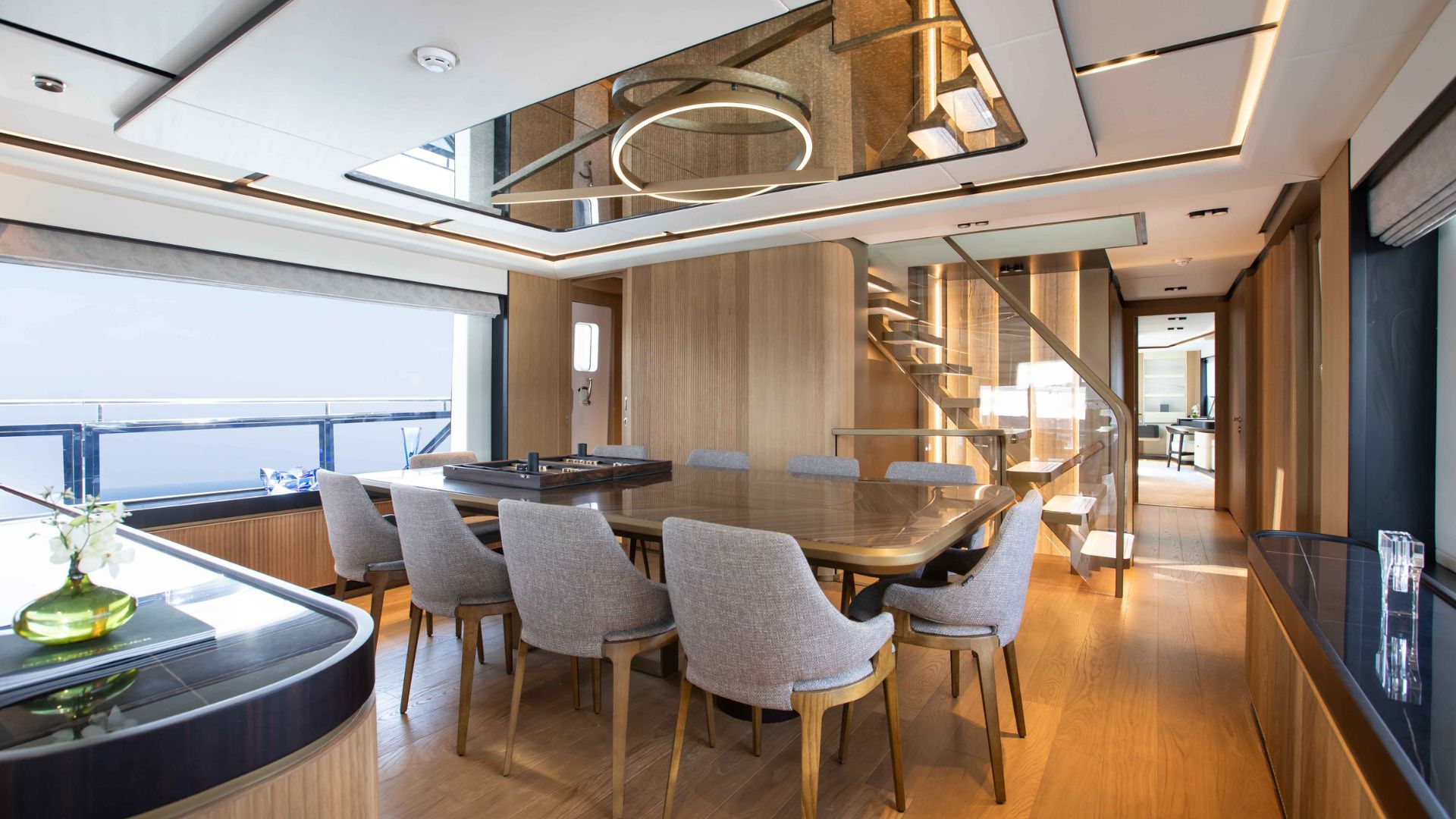 Кормовая часть Majesty 111 встречает гостей большой зоной отдыха со стильным диваном и столиками. Далее мы попадаем в главный салон с панорамными окнами, такой же просторной зоной отдыха и формальной обеденной зоной. В носовой части расположена обеденная зона на свежем воздухе и джакузи. Принять солнечные ванны гости смогут на сандеке, где также есть крытая зона с диваном и баром.
