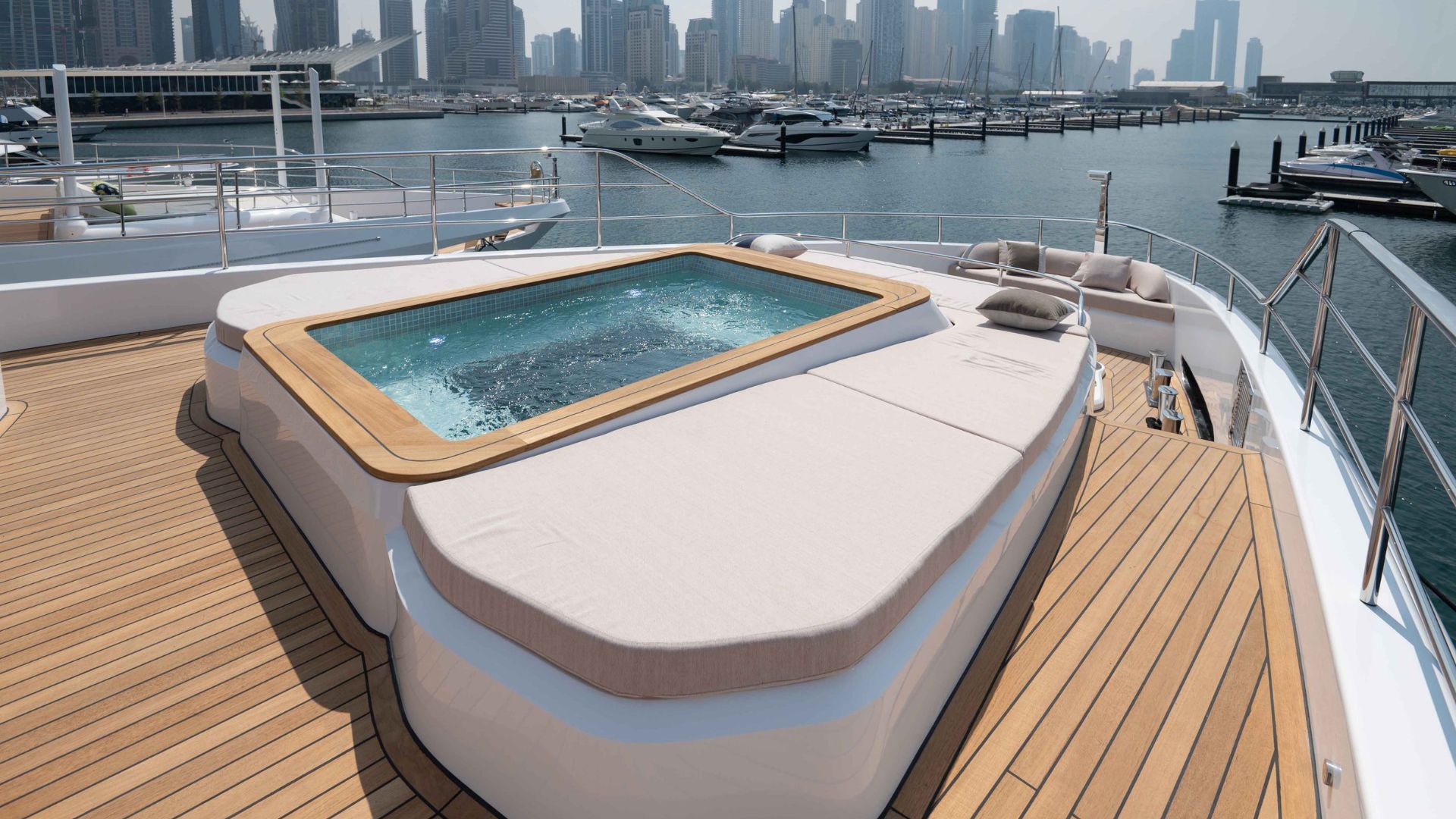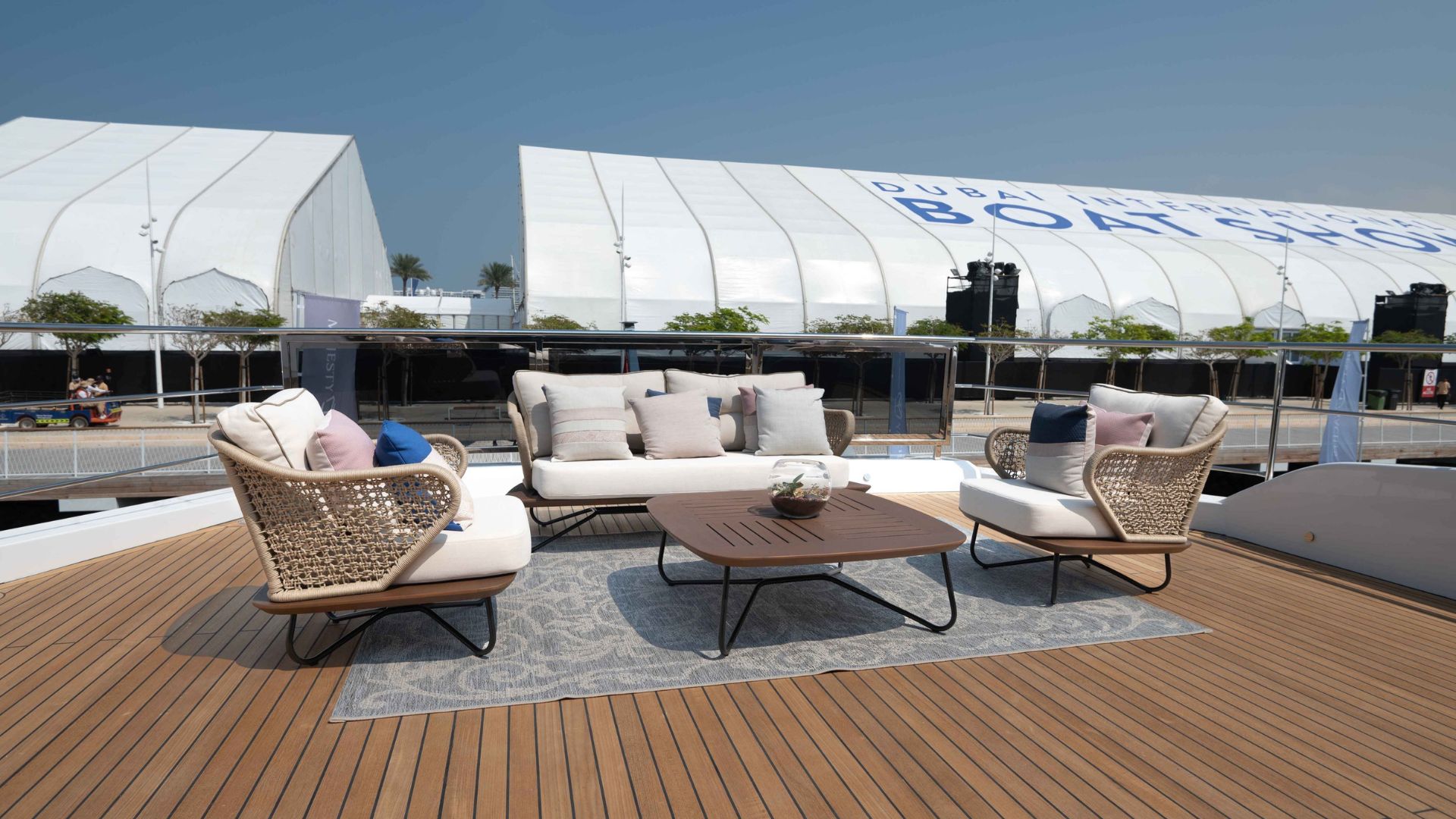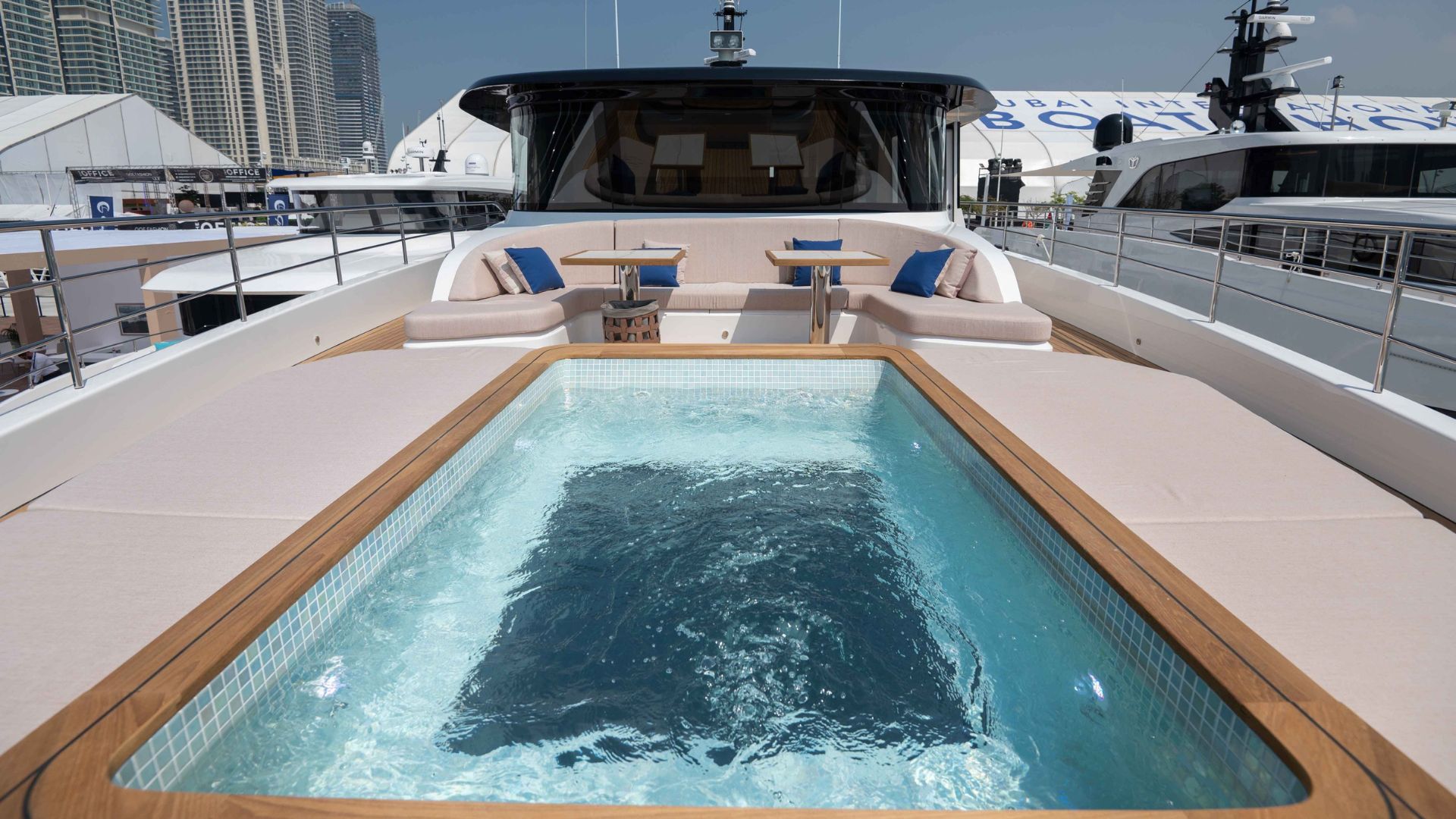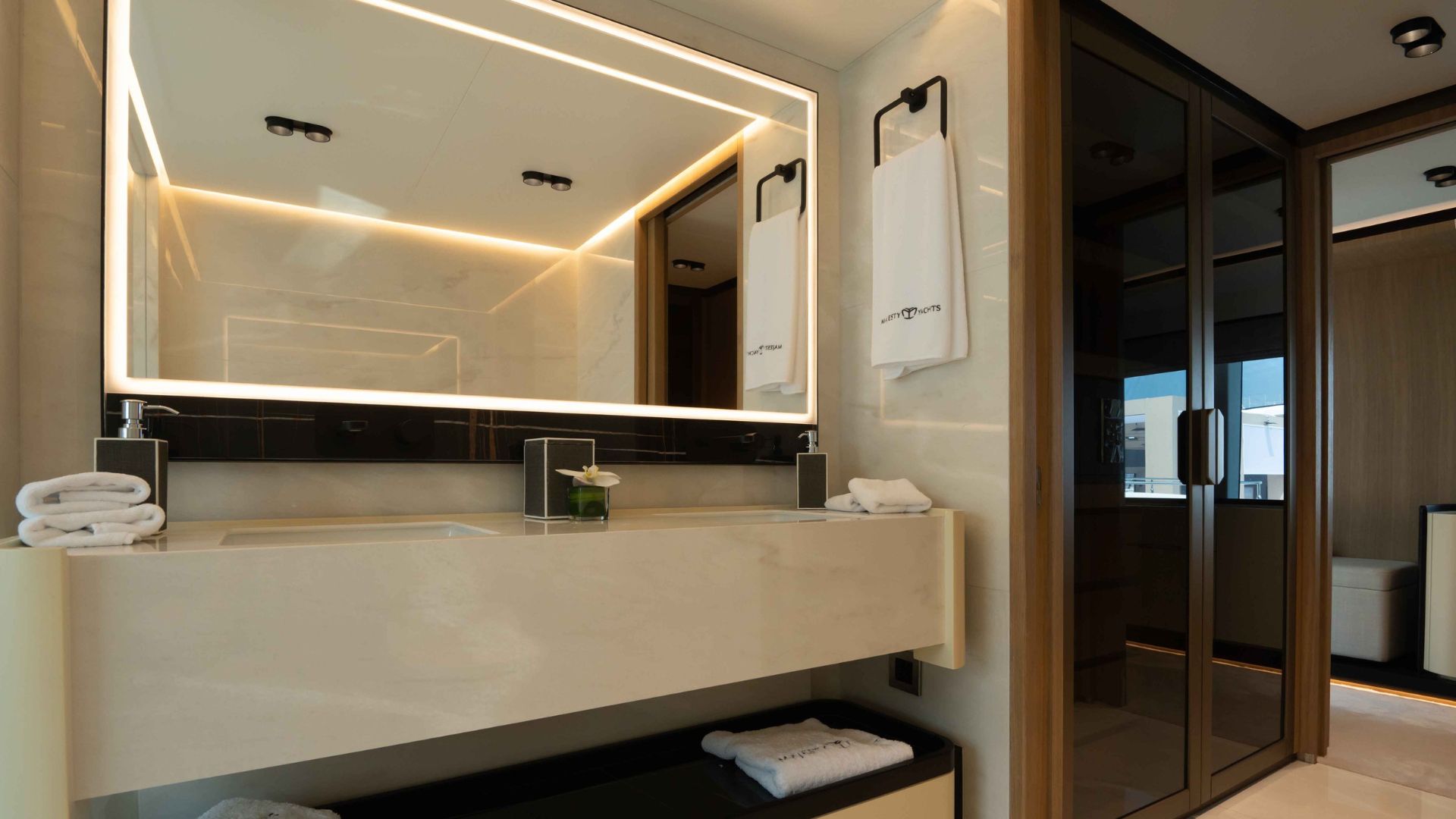 Кормовая часть Majesty 111 встречает гостей большой зоной отдыха со стильным диваном и столиками. Далее мы попадаем в главный салон с панорамными окнами, такой же просторной зоной отдыха и формальной обеденной зоной. В носовой части расположена обеденная зона на свежем воздухе и джакузи. Принять солнечные ванны гости смогут на сандеке, где также есть крытая зона с диваном и баром.