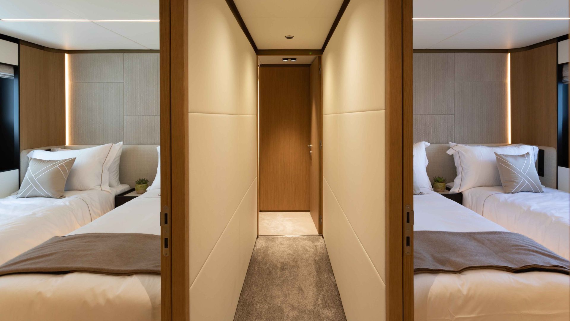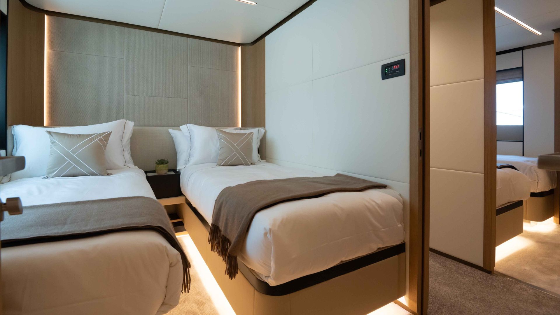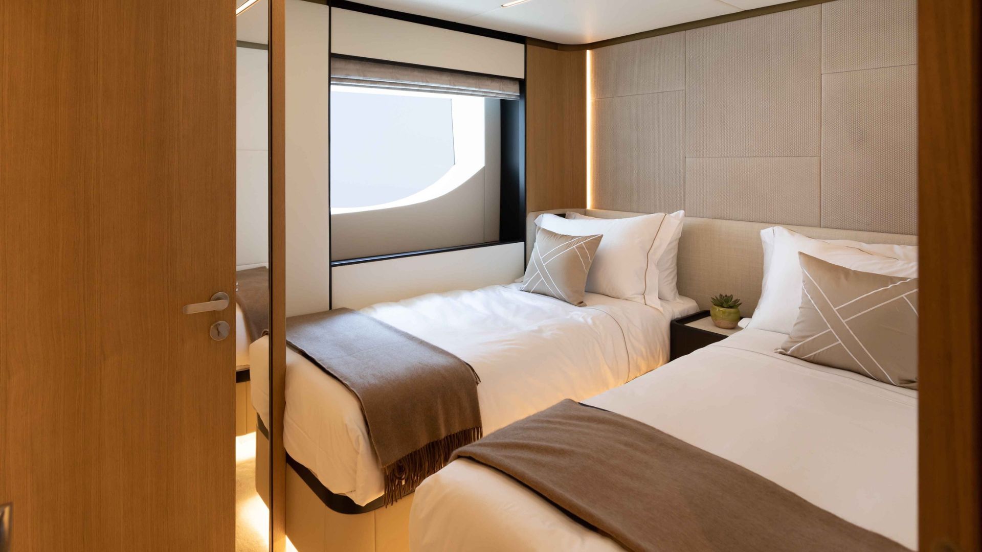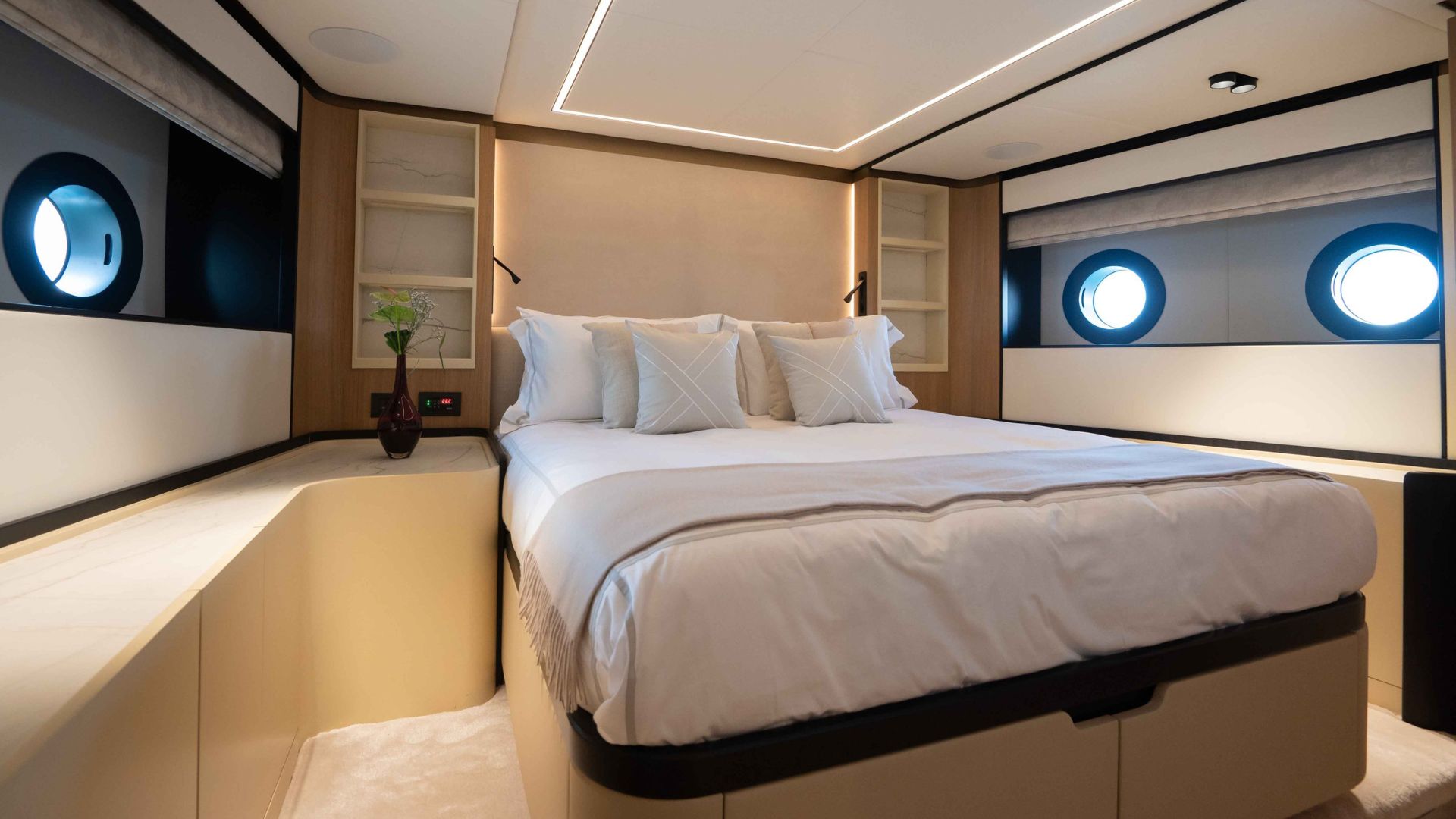 Длина новой модели составляет 34.1 метра, внутренний объем 240 GT, а конфигурация с шестью каютами позволит разместить до 12 гостей в шести каютах.