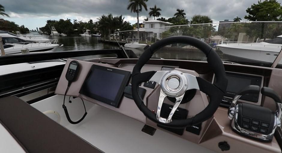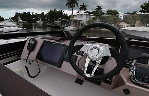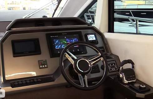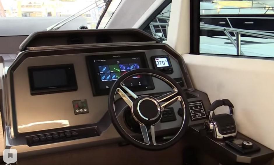 Обратите внимание на большое открытое окно по левому борту камбуза. Нижний пост управления максимально удобный и имеет отличную обзорность, еще и за счет цельного лобового стекла. Многофункциональный дисплей Raymarine, информационный дисплей volvo penta и автопилота.