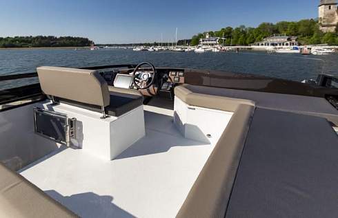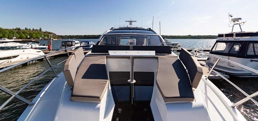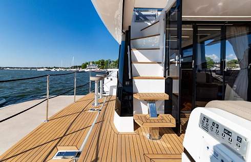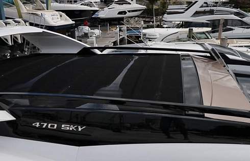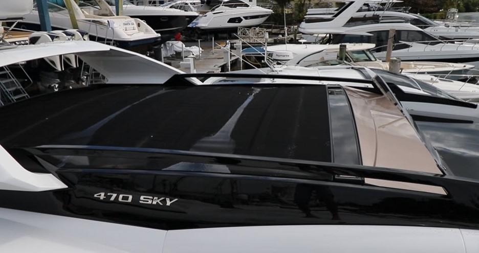 Когда мы смотрим со стороны, мы видим идеальный стремительный силуэт, свойственный только спортивным яхтам с хардтопом. В тоже время, есть возможность управлять яхтой буквально с крыши, где находится не только второй пост управления, но и небольшой низкопрофильный флайбридж или как следует из названия скайдэк. Когда вы его не используете, весь скайдэк закрывает сдвижная крыша, почти как на кабриолете. Далее в обзоре мы расскажем вам о том, как это делается.