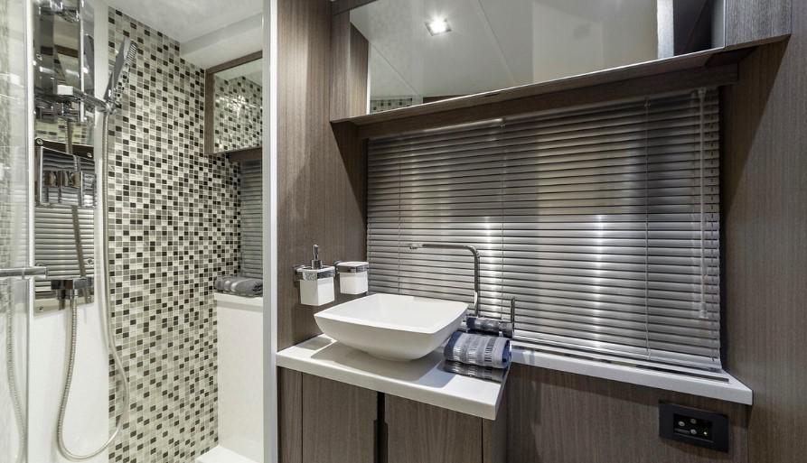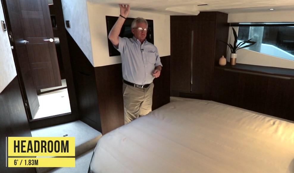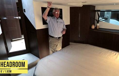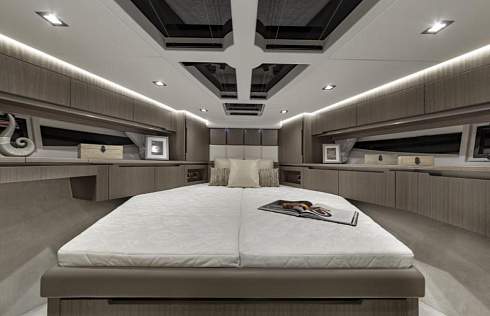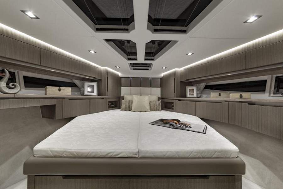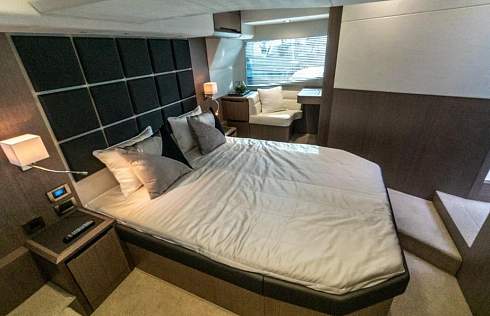 Просторная мастер каюта находится в средней части яхты на всю ее ширину. Высота потолка составляет 1.83 метра, а большие окна наполняют ее естественным светом. По левому борту есть удобный туалетный столик. Так же в мастер каюте есть 32 дюймовый телевизор.