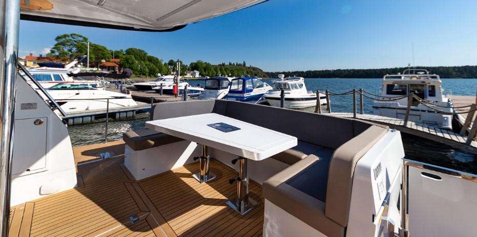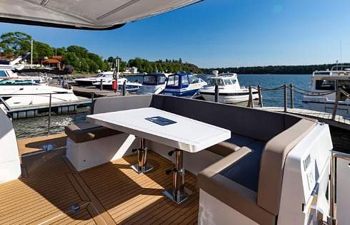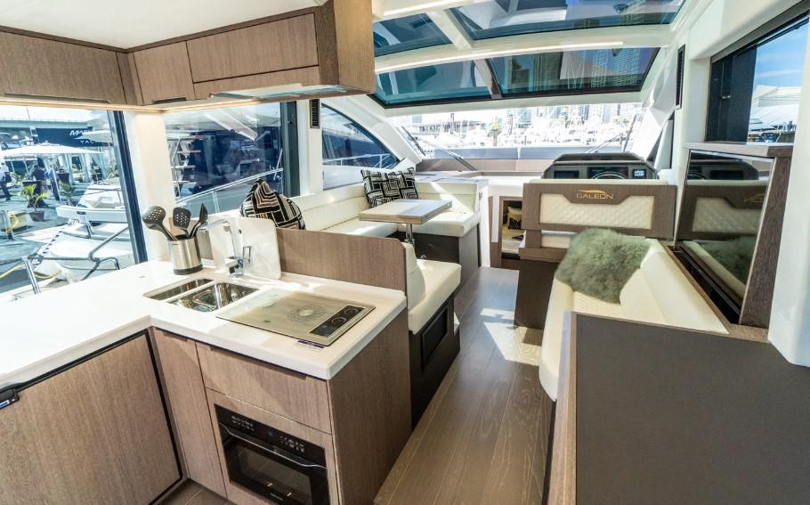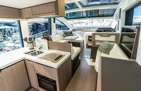 Стеклянные двери открываются на всю ширину, что и создает единое пространство с кокпитом. В камбузе по левому борту есть раковина, двухкомфорочная плита и микроволновая печь. Достаточно много места для приготовления пищи. Холодильник и морозильник находятся под стойкой. В середине салона есть U образная зона со столом, которая должна вмещать по меньшей мере человек 6. Стол так же можно опустить, преобразив в кровать. Напротив расположился выезжающий 42 дюймовый телевизор.
