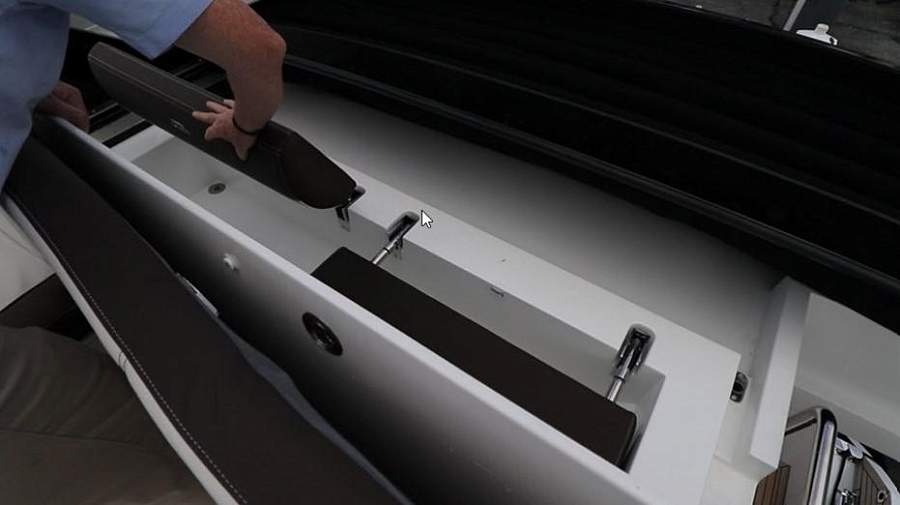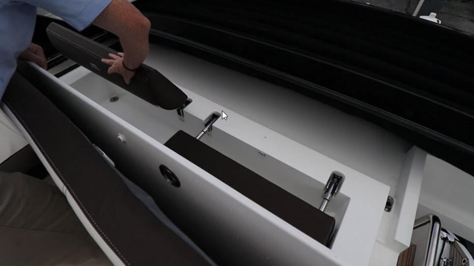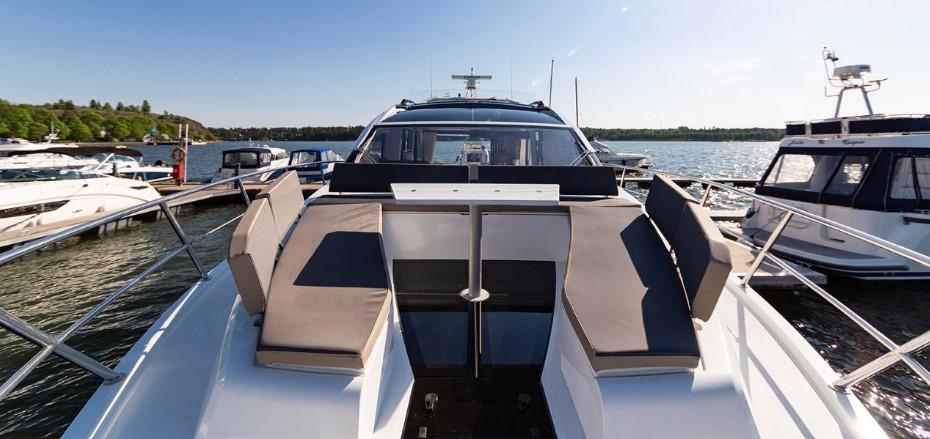 Стоит отдельно отметить зону на носу, потому что это не просто подушки для загара. Она обладает полноценной обеденной зоной со столом креслами и спинками, и необходимым количеством рундуков, что бы удобно было все это хранить.