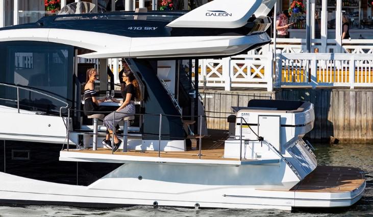 Модель так же обладает фирменной фишкой GALEON YACHTS, это открывающиеся борта, которые увеличивают ширину яхты и создают единое пространство кокпит – салон, образуя уютный бар и огромное количество дополнительного места. В купе с гидравлической купальной платформой все это образует «пляжный клуб».