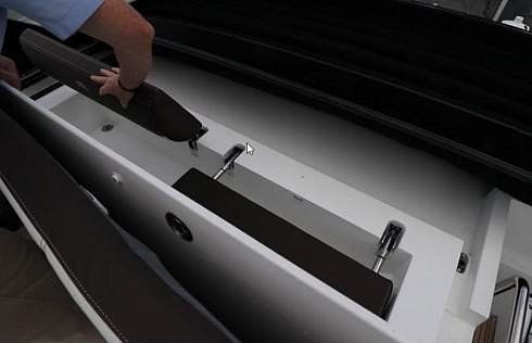 Гидравлическая купальная платформа на корме, куда можно поставить тендер, имеет грузоподъёмность 400 кг и ширину 1.12 метра. Там же на корме есть душ и место под гриль.