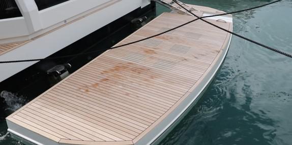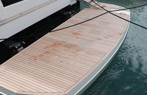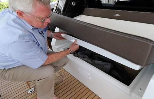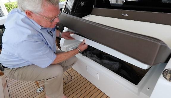 В яхте продуманно все до мелочей. Много рундуков для хранения всего необходимого. Швартовые лебедки смотрятся очень органично. В кормовой части яхты очень стильно смотрятся хромированные детали вывода вентиляции моторного отсека. Под кормовыми «утками» есть специальные рундуки для швартовых.