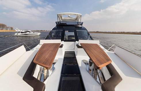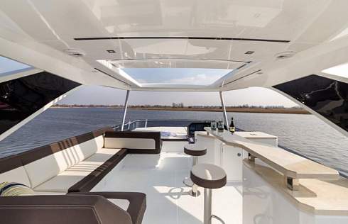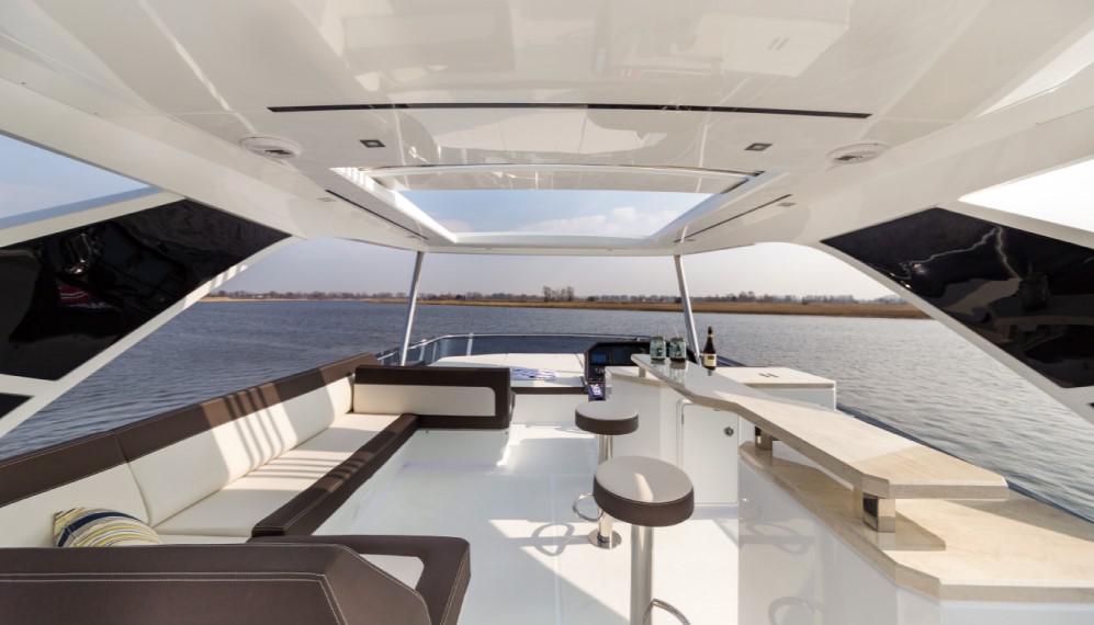 GALEON 640 FLY обладает несколькими открытыми зонами для отдыха, что отлично подходит для путешествий большой компанией. Просторный флайбридж с жестким тентом от солнца, множеством мест для загара и баром – любимое место многих.