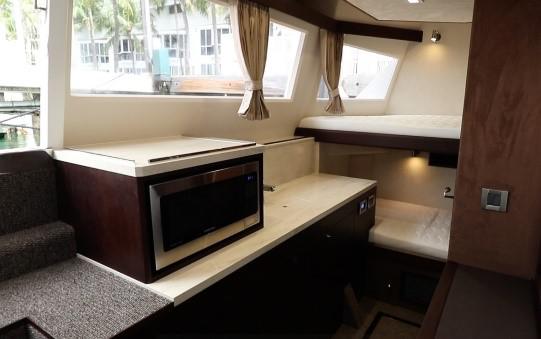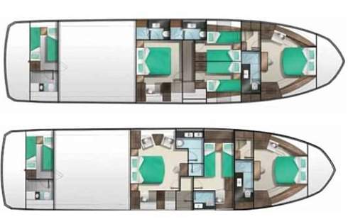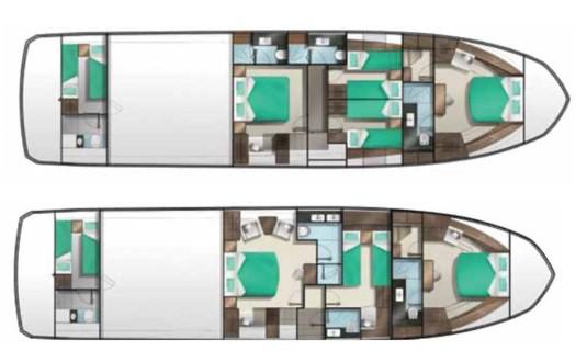 Компоновка кают на нижней палубе возможна как с 4 каютамя, так и 3 с огромной мастер каютой на миделе яхты. Каюта экипажа находится в кормовой части лодки.