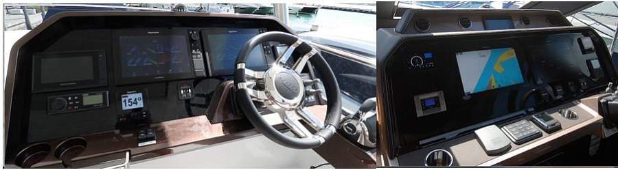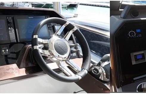 На верхнем посту управления, на флайбридже, в нашем распоряжении два 12 дюймовых сенсорных дисплея RAYMARINE. Системы электронного управления яхтой Volvo Penta EVC.Управление музыкой. Дисплей управление автопилотом. Джойстики управления подруливающими устройствами. Кнопки управление транцевыми плитами и электронные ручки управления газ – реверс. Рулевое колесо так же имеет регулировки по углу наклона.