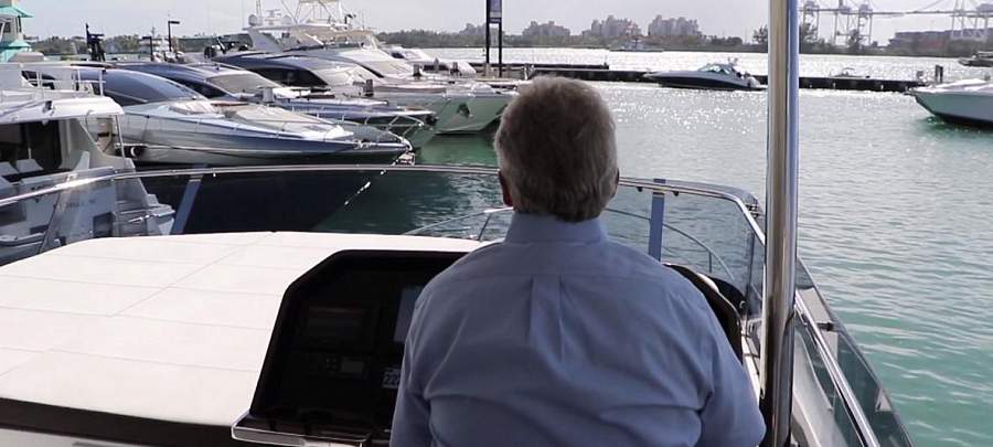 Несмотря на серьезное волнение на воде, вызванное сильным ветром, яхта показала отличную управляемость в ограниченном пространстве марины, продемонстрировав мощность подруливающих устройств.