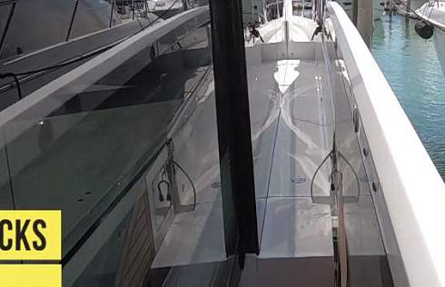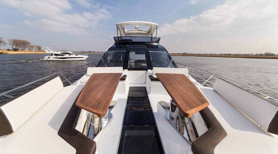 Обитаемая зона для обеда или загара на носу. Инновационное решение сделать проход из салона на нос яхты прямо через лобовое стекло, оборудовав его центральную часть электрической дверью.