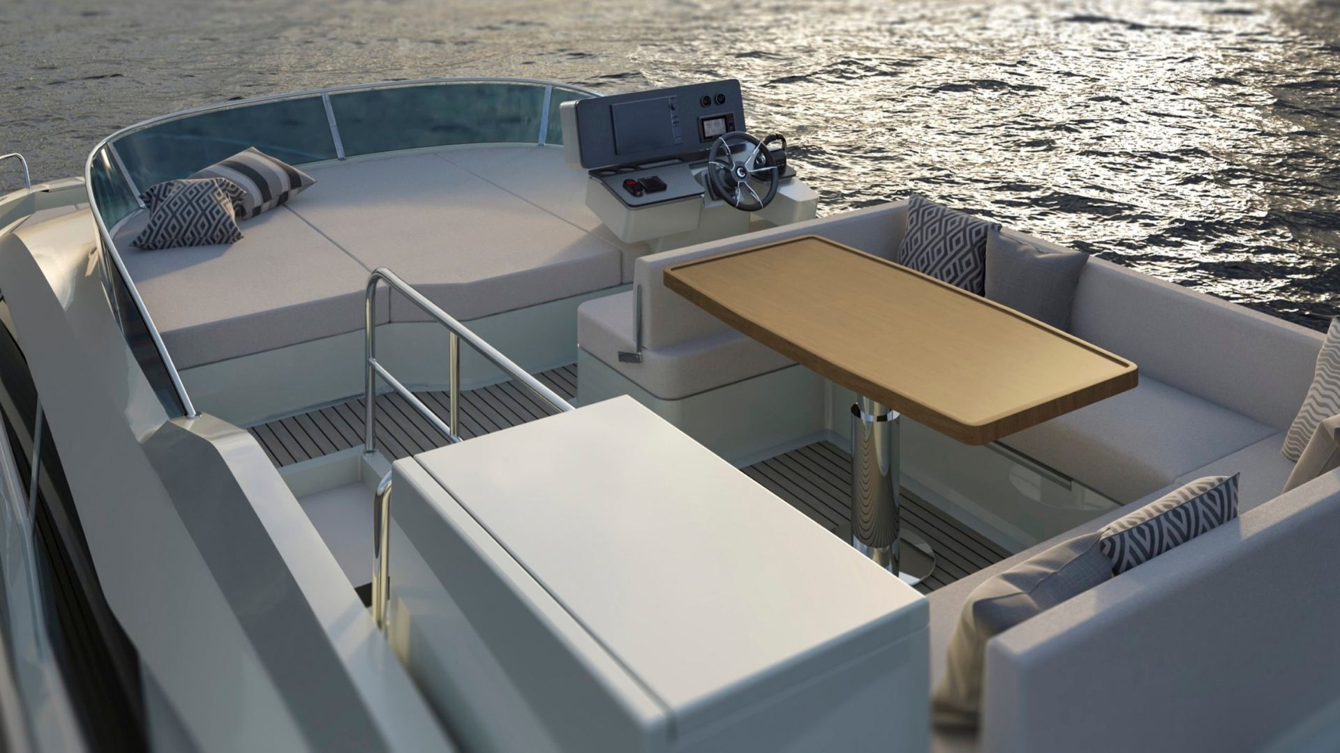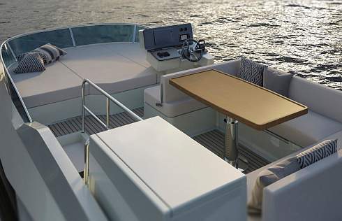 Открытые пространства Majesty 49 впечатляют. В кокпите можно найти удобный диван, а проходы по бортам обеспечивают доступ к носовой палубе, где можно отдохнуть и позагорать на лежаках. Спортивный пост управления на флайбридже обеспечивает по-настоящему приятные ощущения от вождения. Здесь же располагается вместительная обеденная зона с грилем и большая зона для загара.