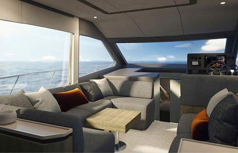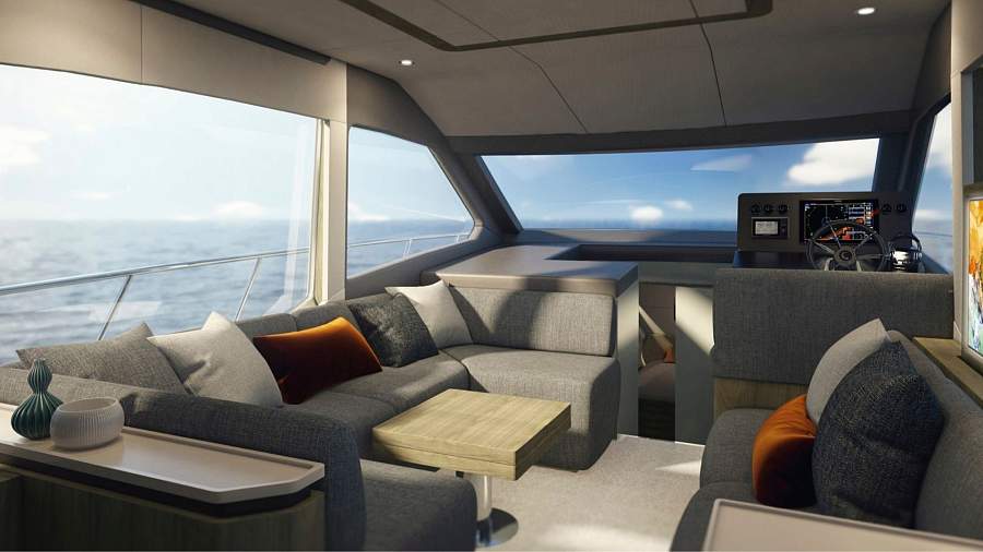 Интерьер 49 дополнен большим открытым камбузом в кормовой части салона. Светлый и просторный салон оборудован вместительной зоной отдыха по левому борту и развлекательной системой по правому борту.