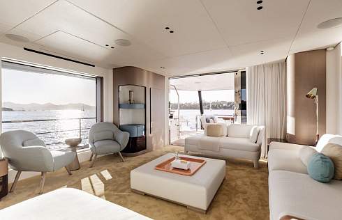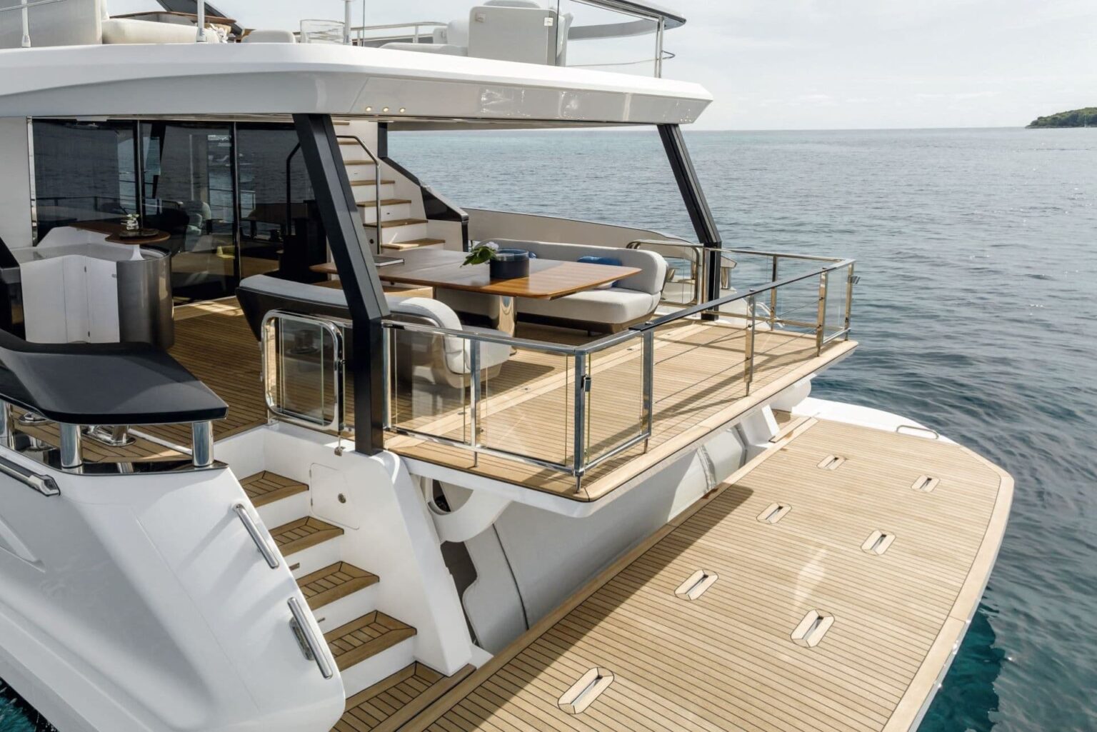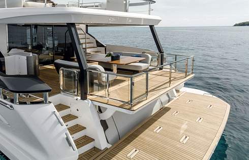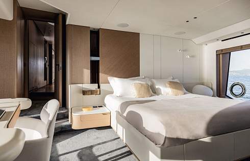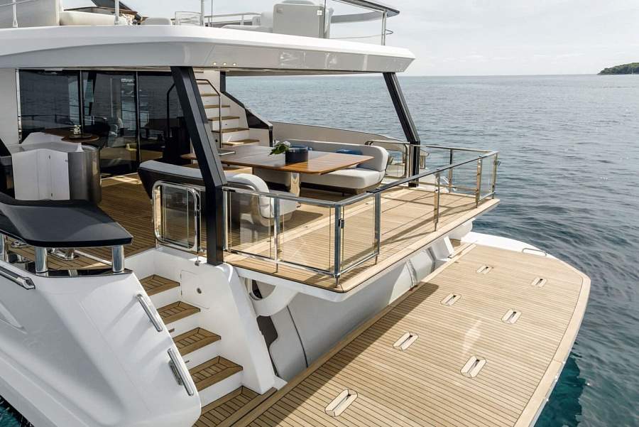 Яхта построена в 2022 году и имеет множество особенностей: поднимающийся транец увеличивает кормовую часть, мастер-каюта с окнами от пола до потолка расположена на главной палубе, 4 гостевые каюты с огромными окнами и открывающимися иллюминаторами - на нижней палубе, один из самых больших флайбриджей в своей категории.