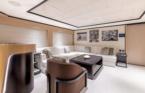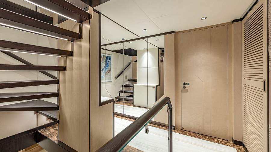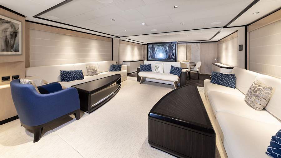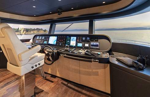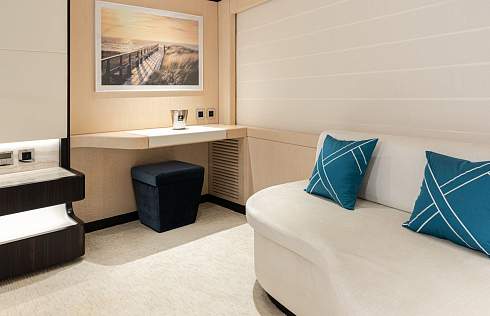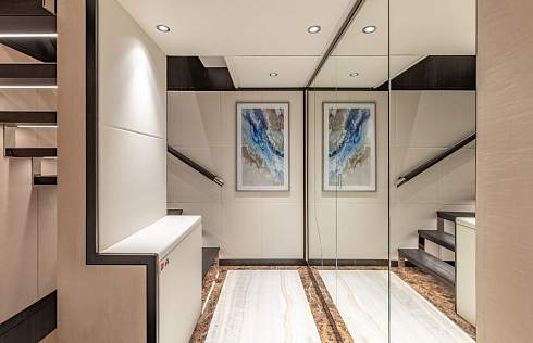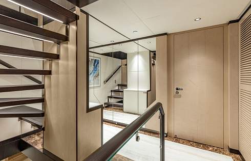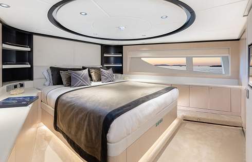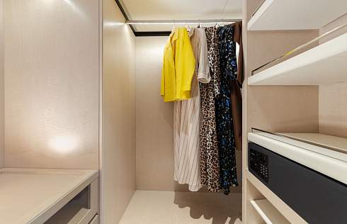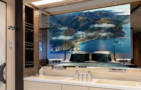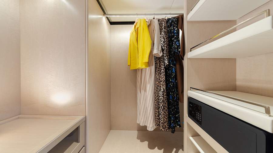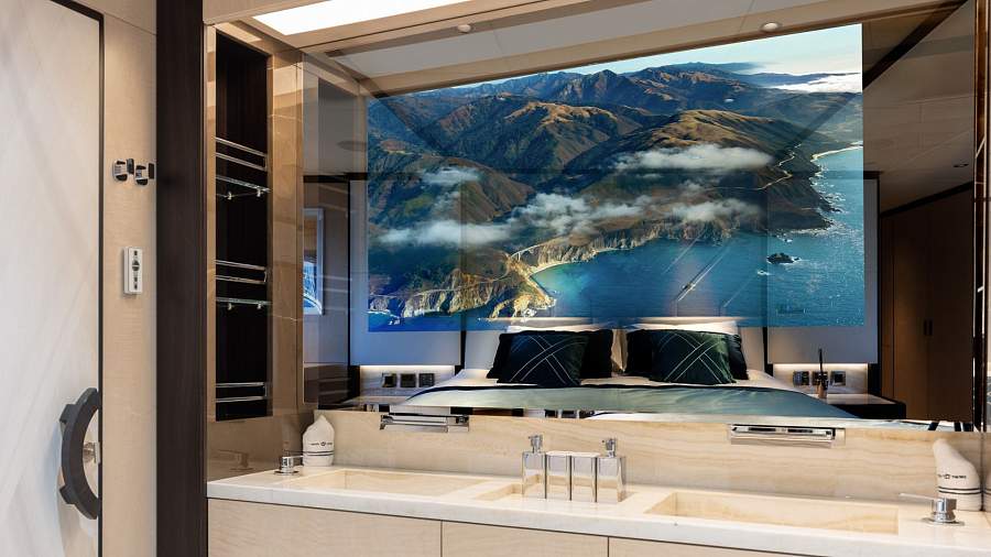 • на главной палубе расположена каюта владельца во всю ширину корпуса с гардеробной и со встроенным в зеркало телевизором;