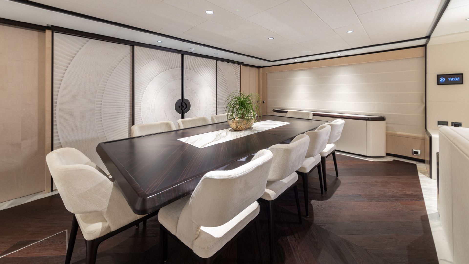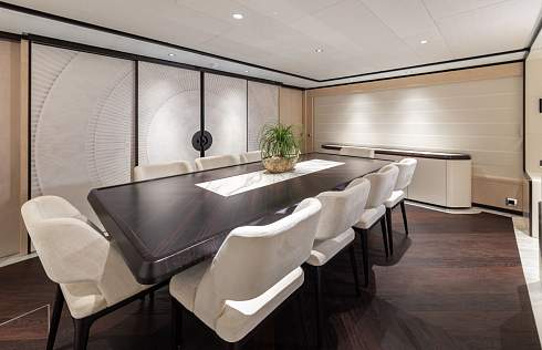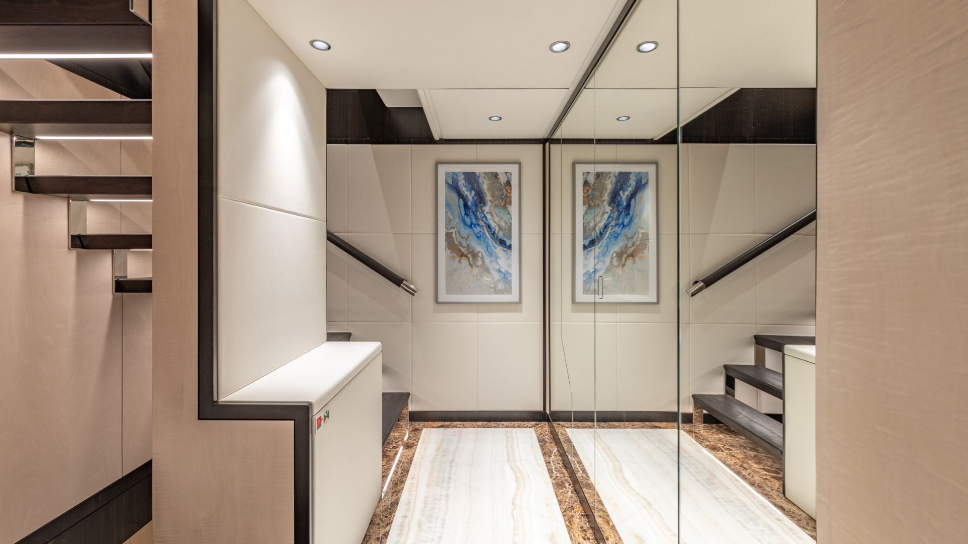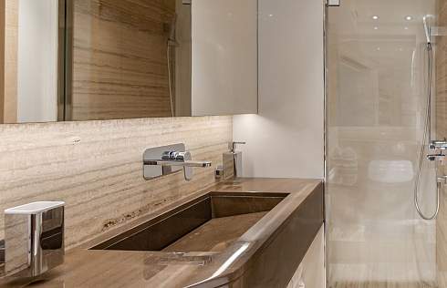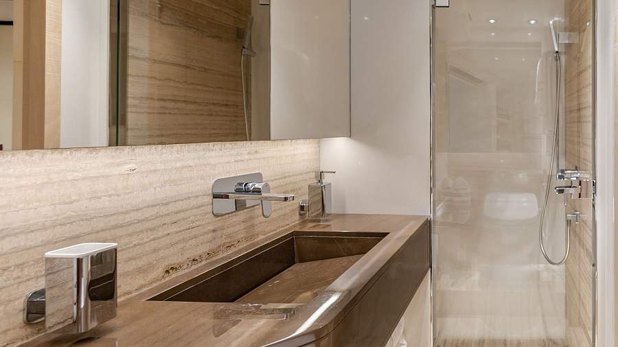 • на главной палубе расположена каюта владельца во всю ширину корпуса с гардеробной и со встроенным в зеркало телевизором;