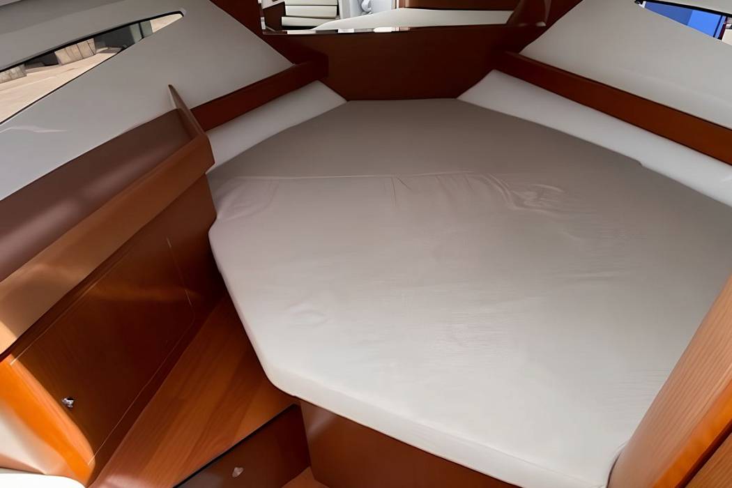 В носовой каюте владельца есть просторная двуспальная кровать, небольшой подвесной шкафчик и полки. В кормовой каюте могут разместиться два человека. Также на нижней палубе находится просторный гальюн с умывальником и душем.