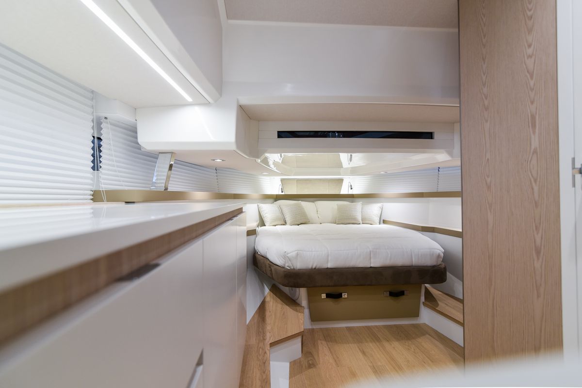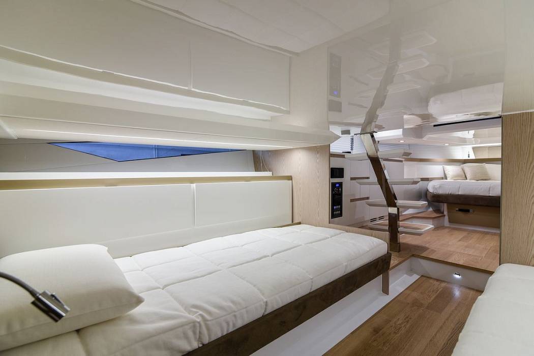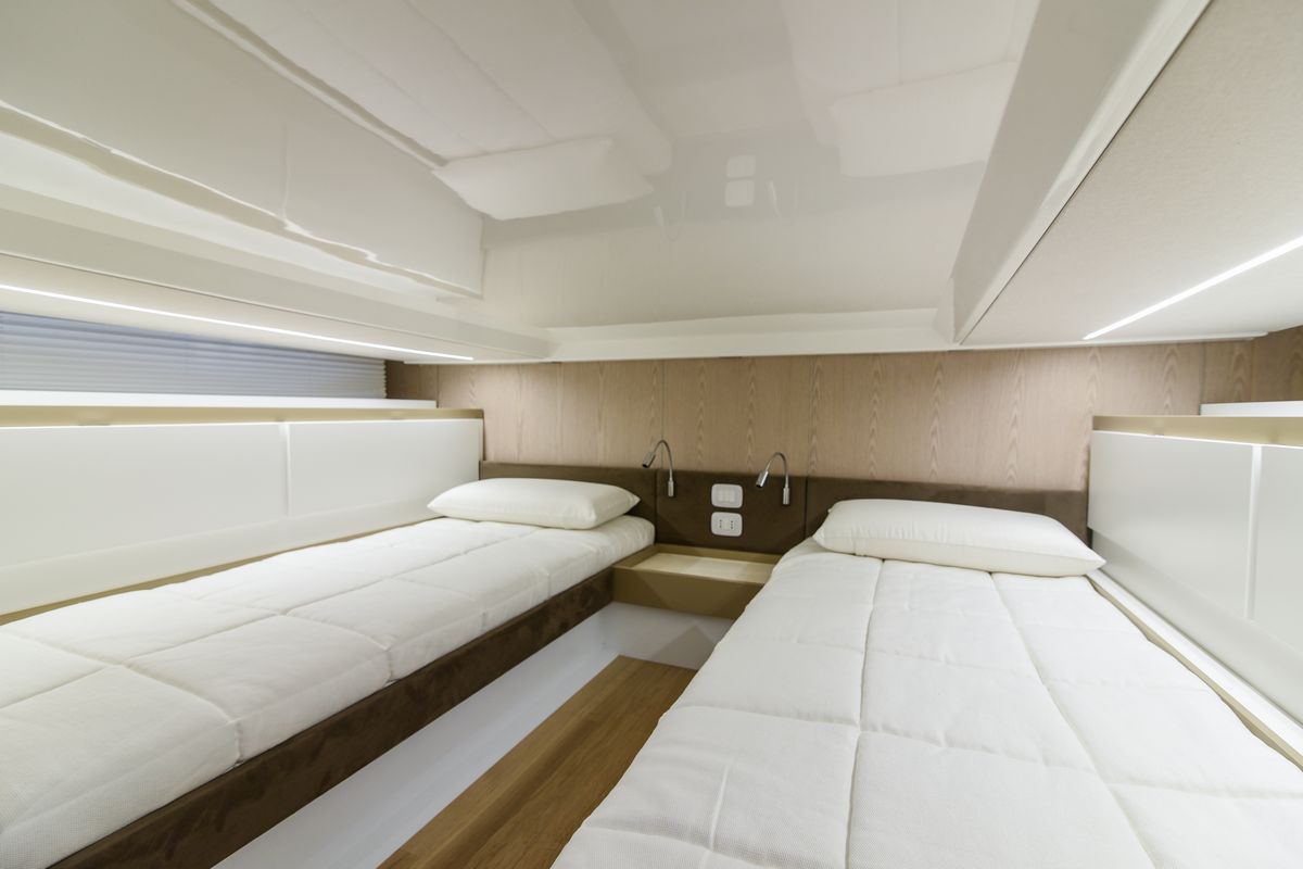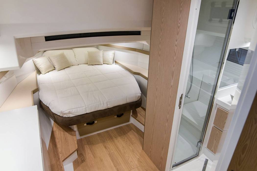 Seawalker 35 предлагается с каютой открытого типа с двуспальной кроватью и большой ванной комнатой с отдельным душем. Еще две односпальные кровати находятся в кормовой части.