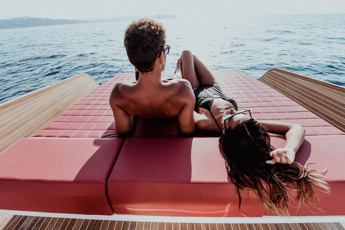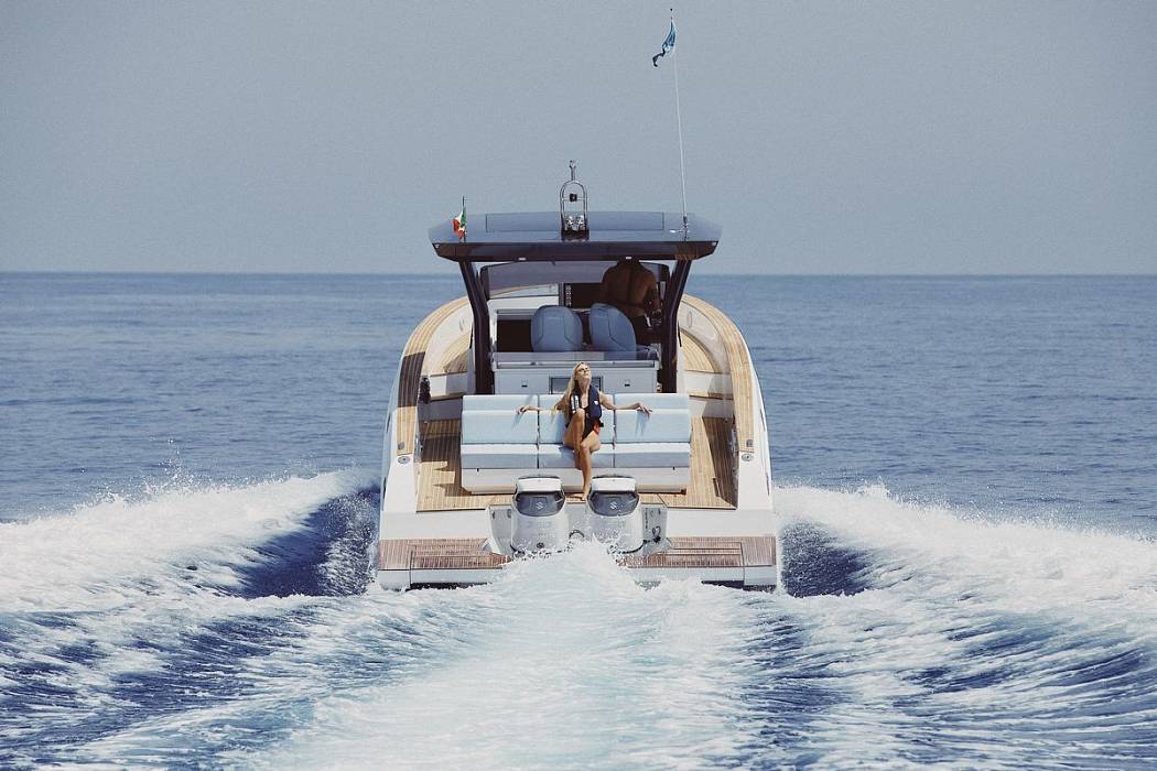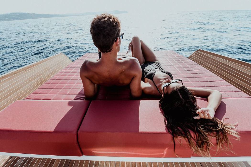 Быстрый доступ к воде обеспечивает платформа для плавания и раскладные борта, а в носовой части расположена зона отдыха, оборудованная удобным круглым диваном.