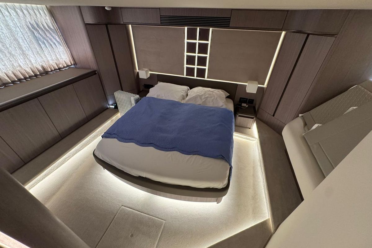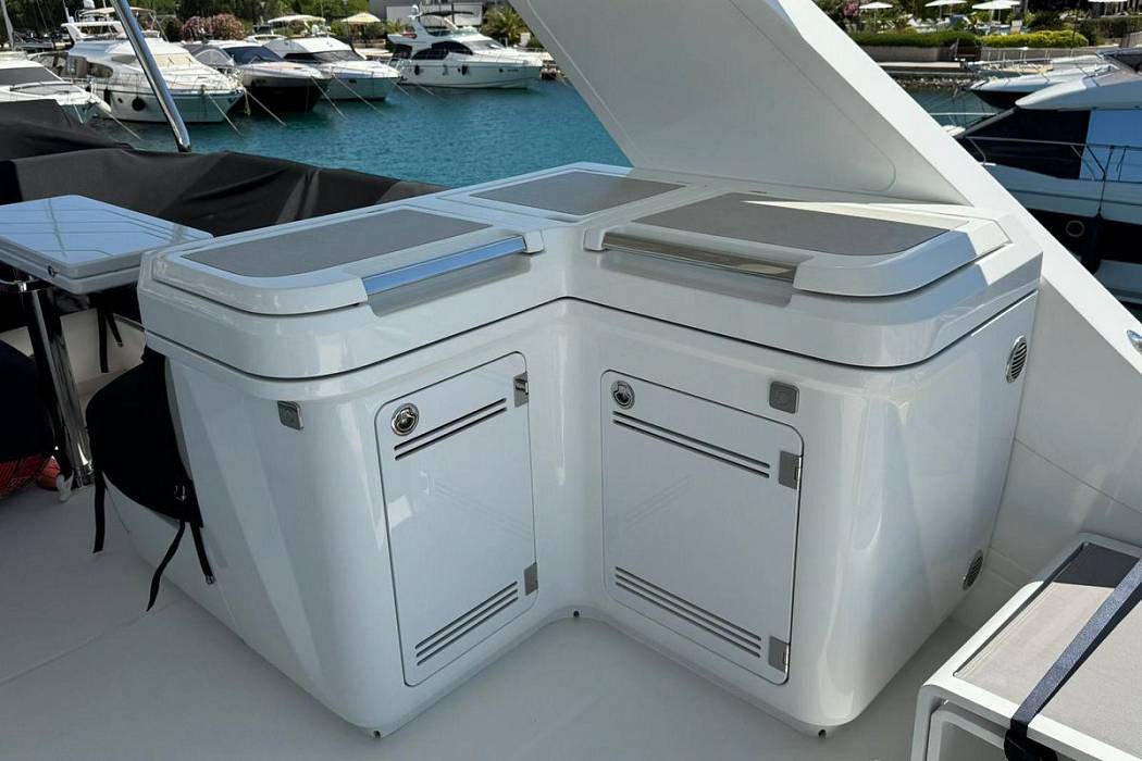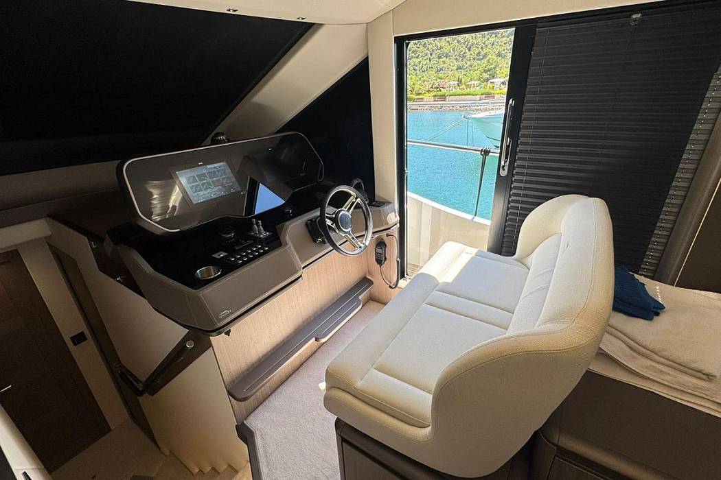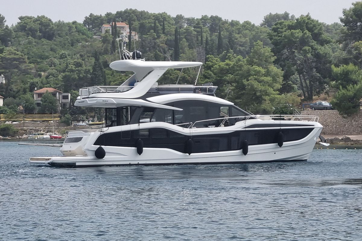Galeon 560 Fly 2024 года оснащена двумя двигателями Volvo Penta D13-900 (наработка 125 моточасов). Яхта оборудована фирменным Beach Mode со складными балконами и гидравлической купальной платформой для тендера или водных игрушек. Планировка включает 3 каюты, каюту капитана и 2 санузла.