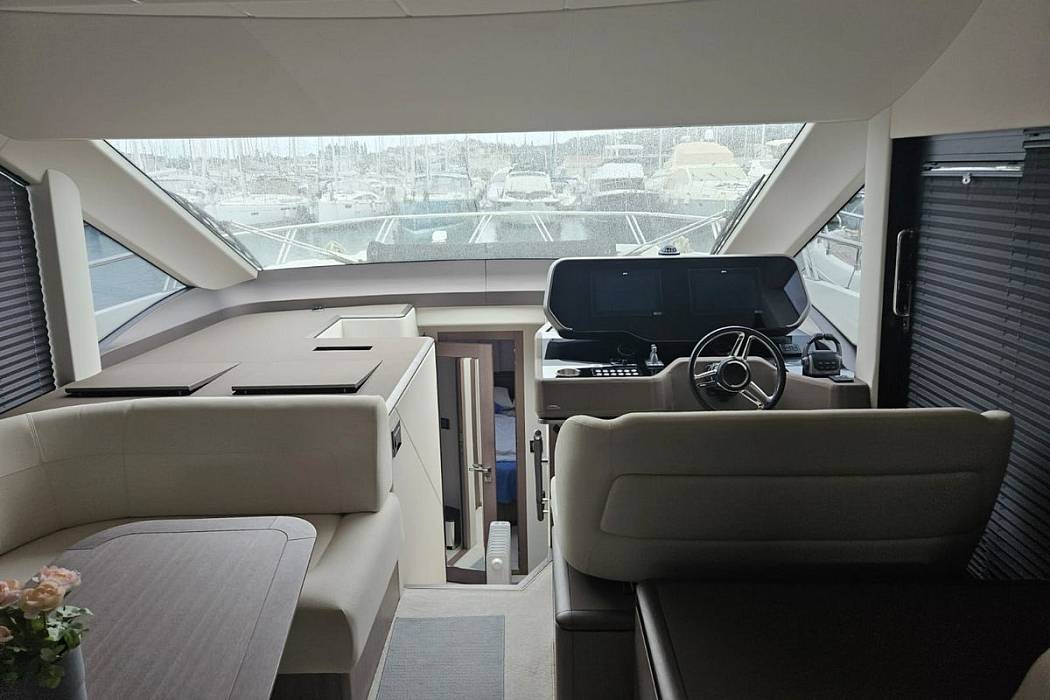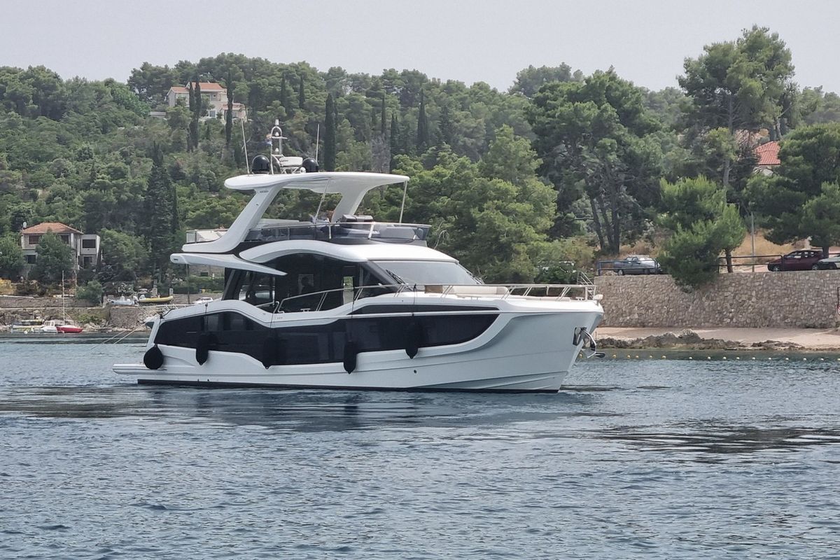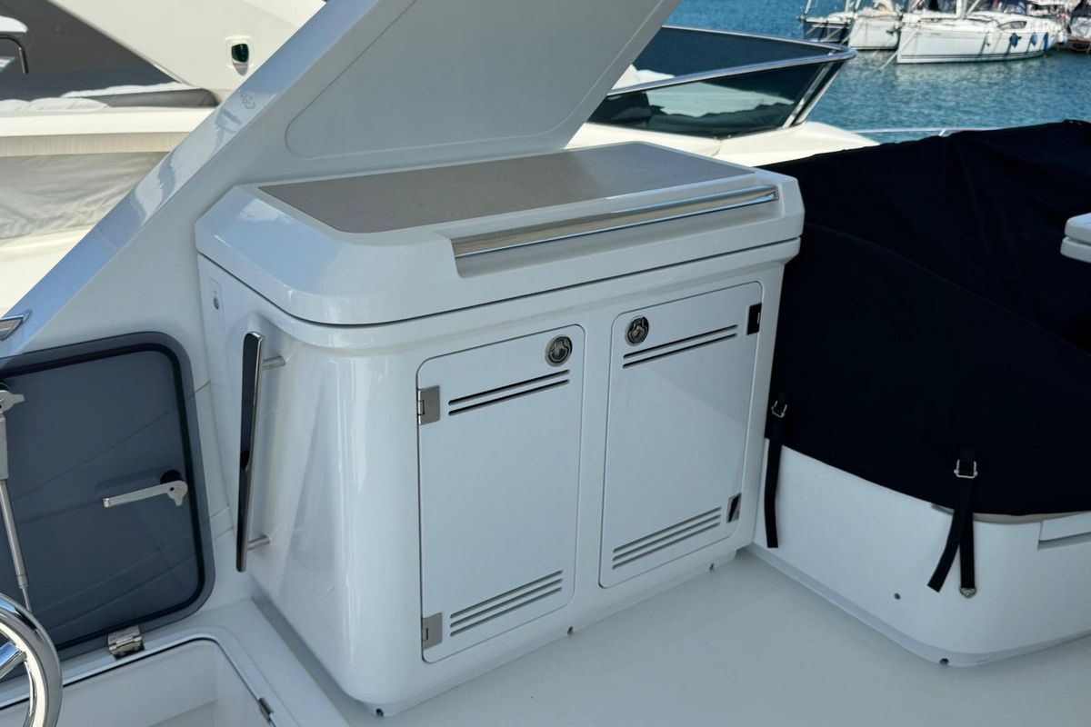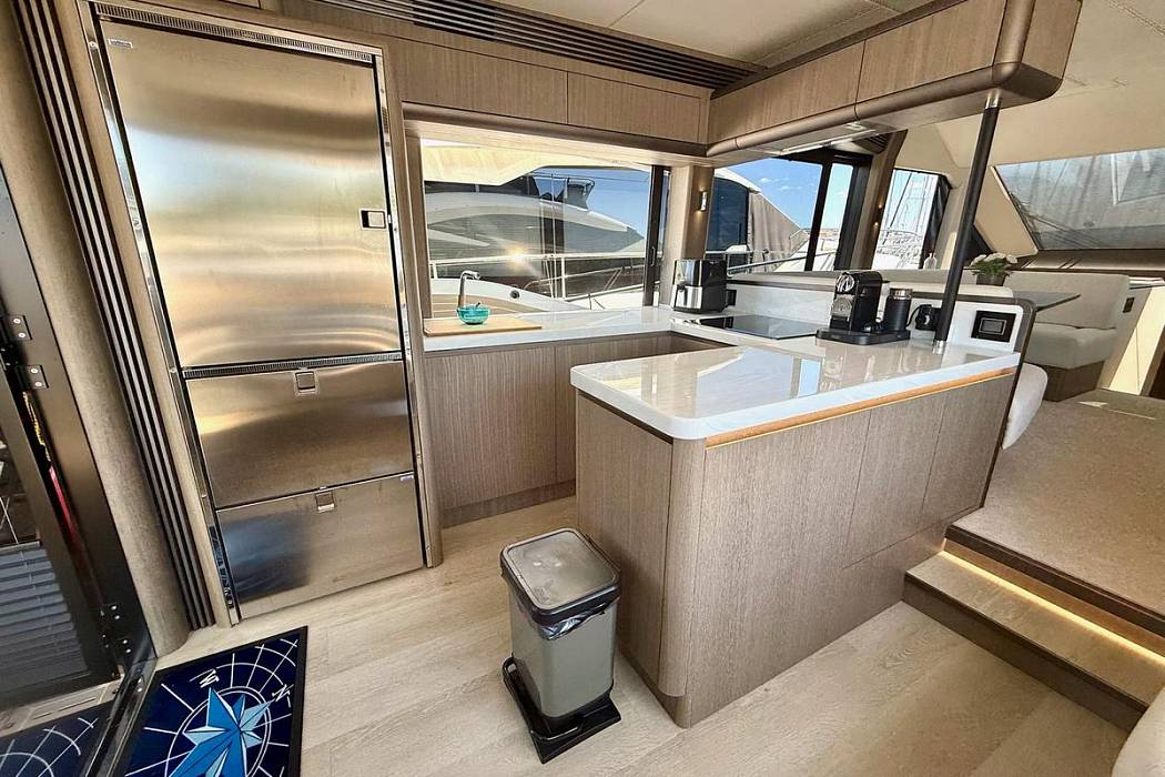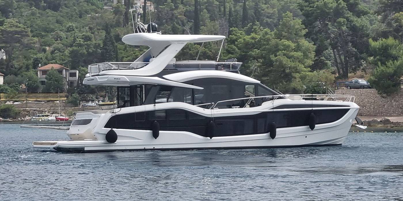 Galeon 560 Fly 2024 года оснащена двумя двигателями Volvo Penta D13-900 (наработка 125 моточасов). Яхта оборудована фирменным Beach Mode со складными балконами и гидравлической купальной платформой для тендера или водных игрушек. Планировка включает 3 каюты, каюту капитана и 2 санузла.