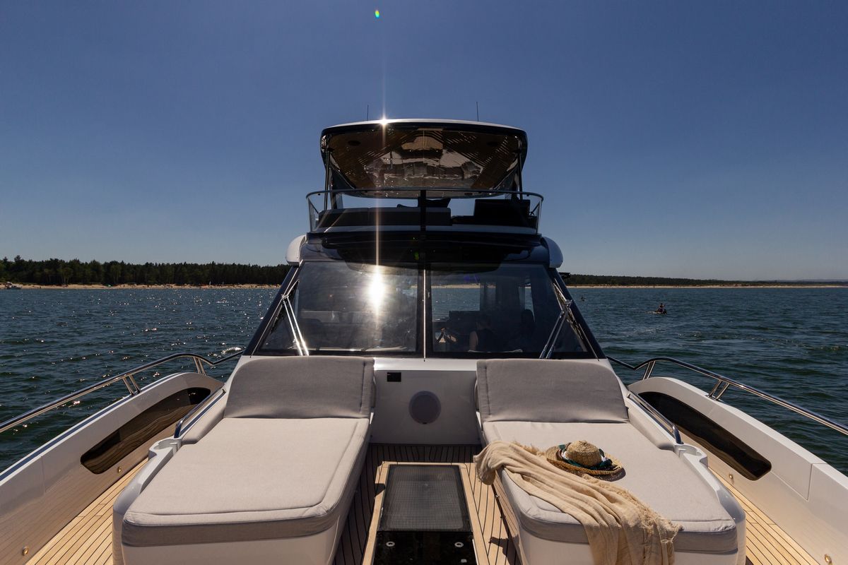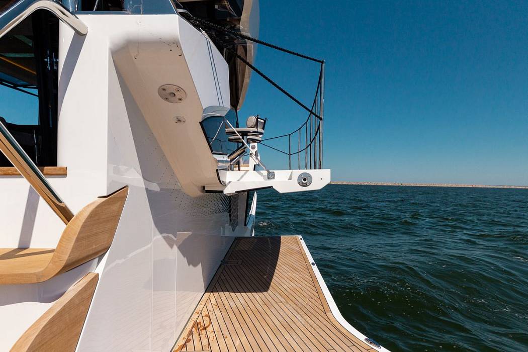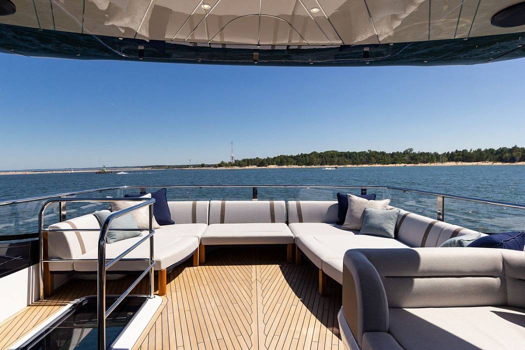 Эта яхта спроектирована с учётом максимальной универсальности. Просторный флайбридж оборудован удобной U-образной зоной отдыха, стильным баром и автоматической сдвижной крышей. Дополнительный тканевый тент обеспечит приятную тень в жаркие дни, делая отдых комфортным в любую погоду. В кормовой части владельцы могут выбрать между отдельными шезлонгами или уютной гостевой зоной — идеальным местом для отдыха и развлечений.
