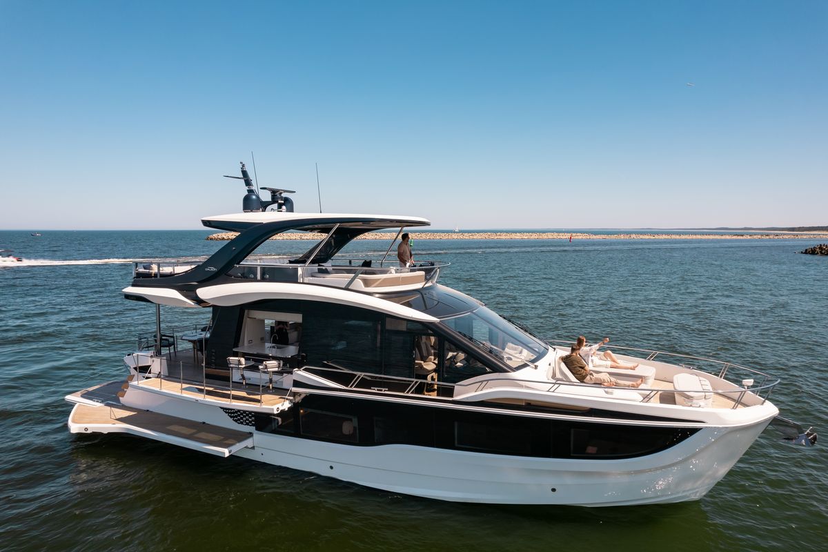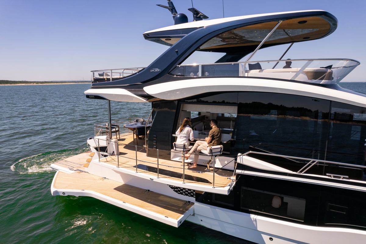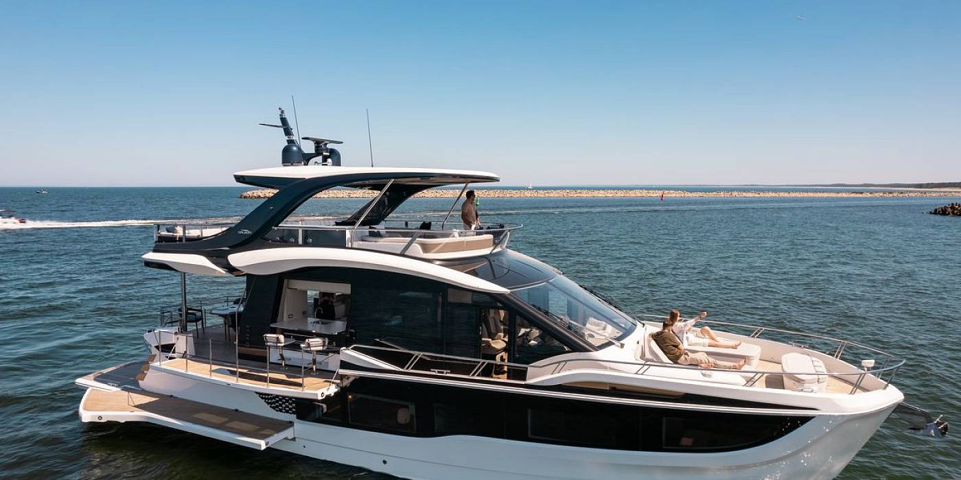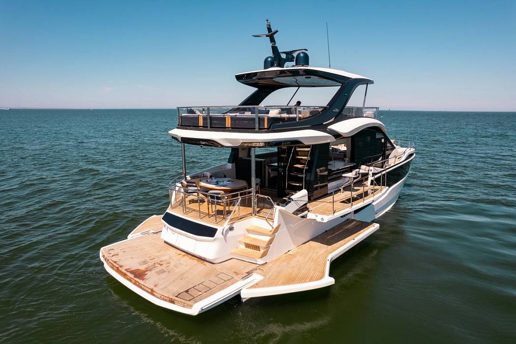 Благодаря гидравлической платформе на корме и балкону с правого борта, Galeon 620 FLY предлагает просторную зону отдыха с прямым доступом к воде — идеальное место для купания и запуска водных игрушек.