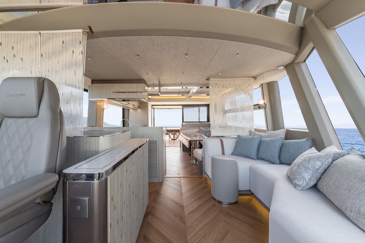 Интерьер, разработанный в сотрудничестве с ведущим дизайн-бюро из Гонконга, отличается изысканной отделкой, настраиваемыми цветовыми решениями и гибкими вариантами планировки, позволяя создать пространство, полностью соответствующее вашим предпочтениям. Каждая деталь на борту Galeon 620 FLY продумана до мелочей, чтобы дарить максимальный комфорт и истинную роскошь без лишних усилий.