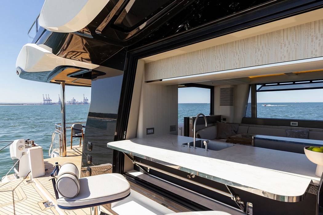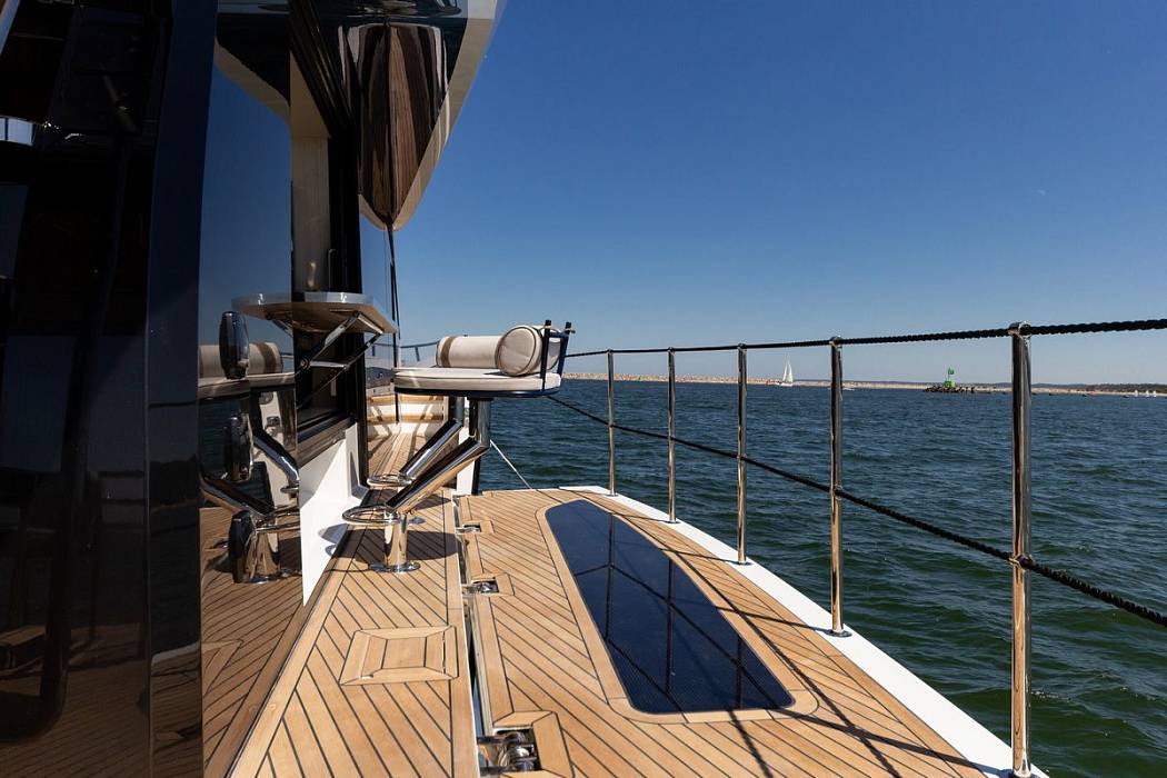 Асимметричная планировка главной палубы позволяет рационально использовать пространство, обеспечивая удобный доступ к носовой зоне. Широкий проход с правого борта ведёт к лаунж-зоне, а инновационные двери-пантографы с обеих сторон обеспечивают свободное перемещение между постом управления и палубой. Центральный сегмент ветрового стекла раздвигается и соединяет салон с передней лаунж-зоной, создавая эффект открытого пространства. Фирменные откидные балконы Beach Mode расширяют кокпит на два метра, открывая новые возможности для отдыха на свежем воздухе.