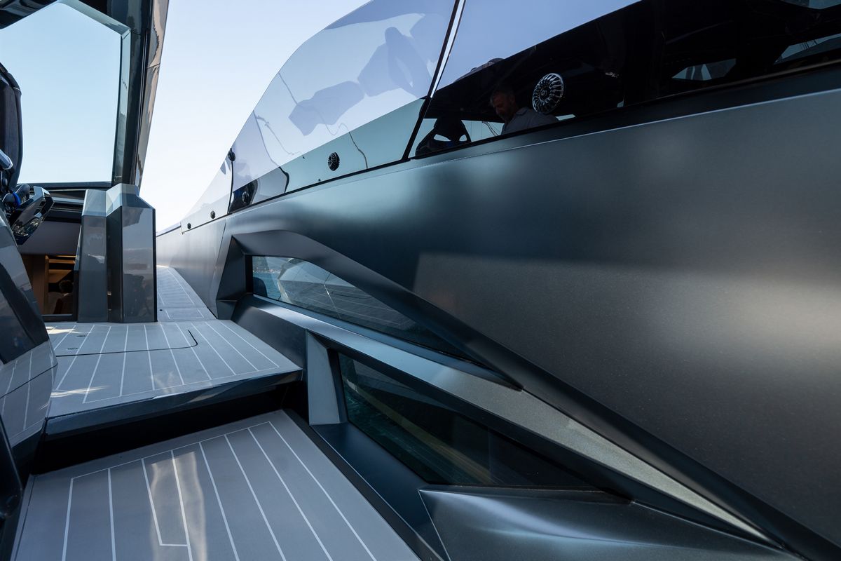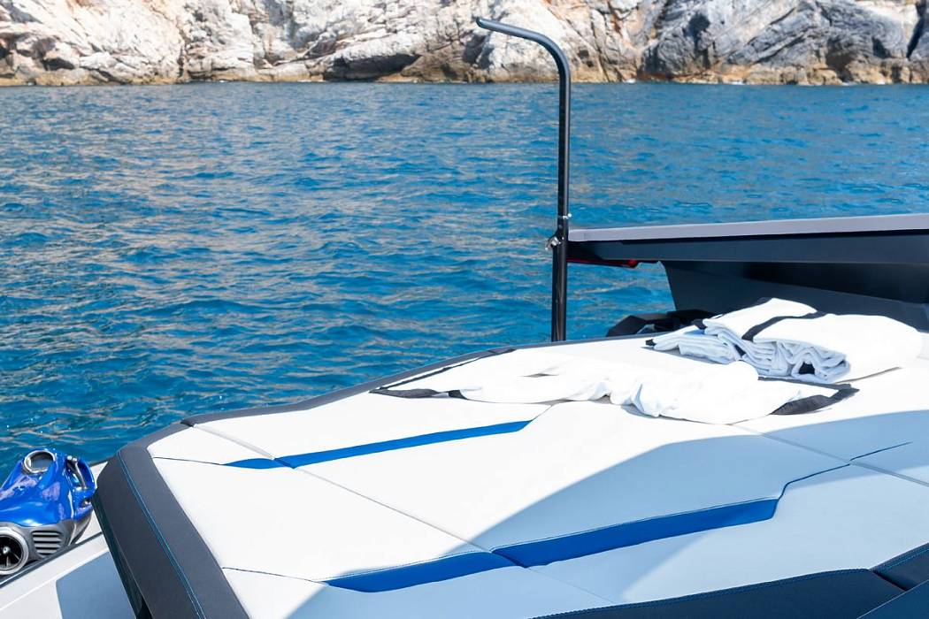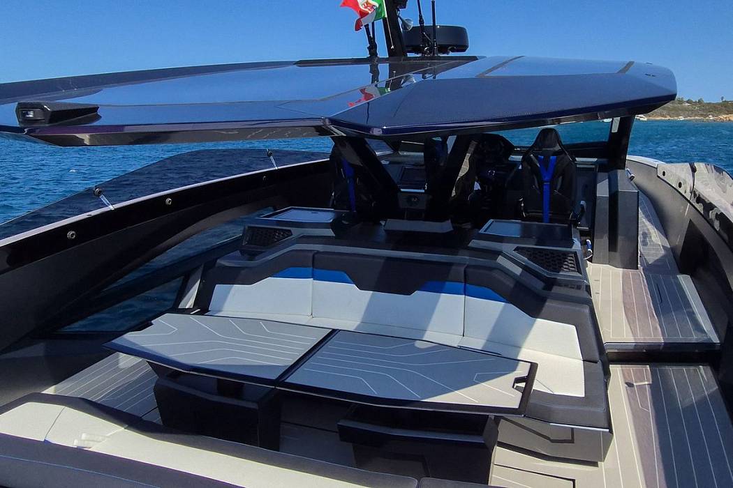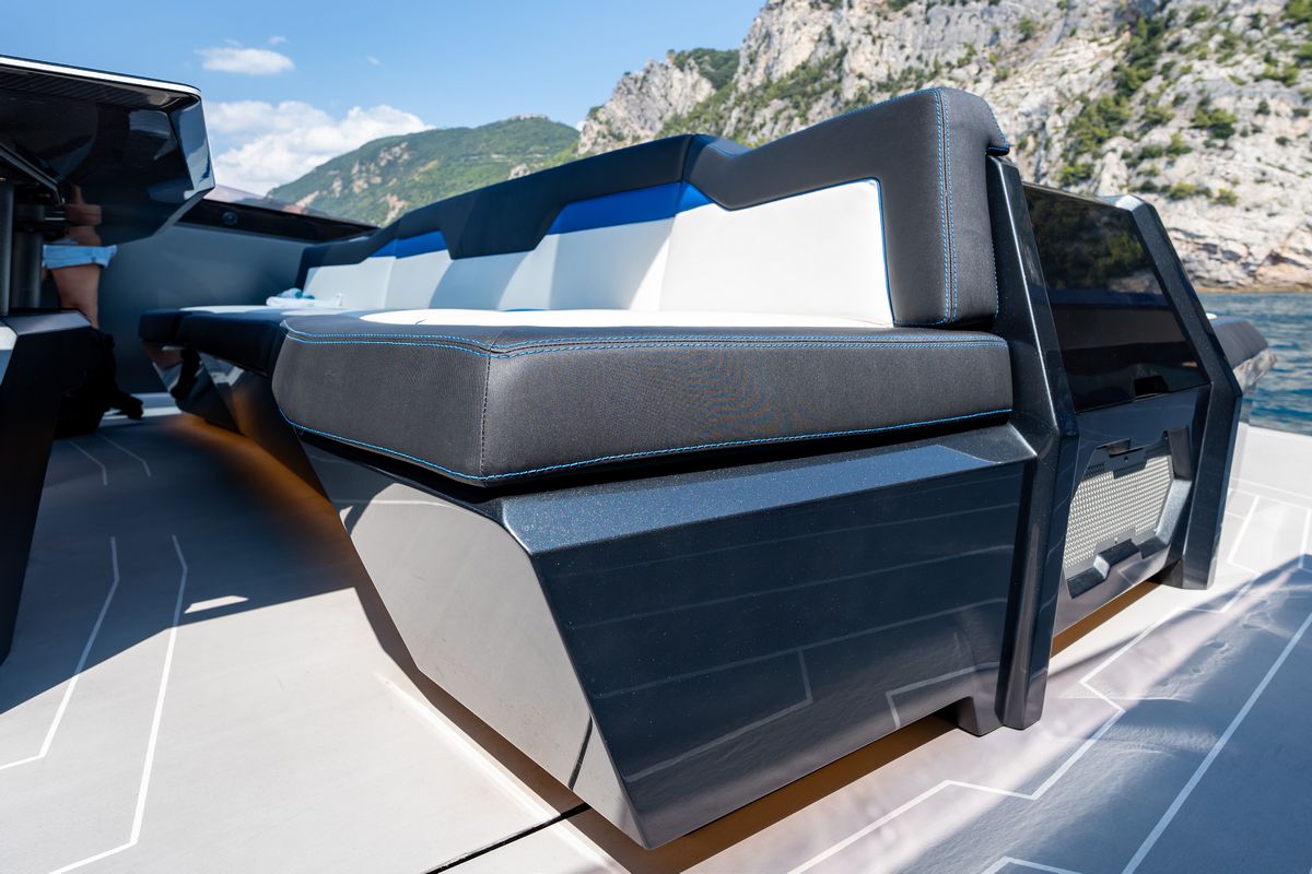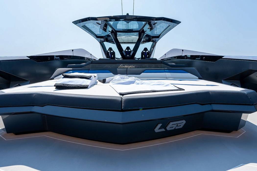 Tecnomar for Lamborghini 63 — это царство карбона и агрессивных граней. Экстерьер модели не оставляет равнодушными соседей по марине: лодка привлекает внимание, заставляет оборачиваться и доставать телефоны. Дизайн предельно выразительный и сразу считывается как продолжение философии одноимённого суперкара.На палубе Tecnomar for Lamborghini 63 очень просторно. При длине около 20 метров дизайнерам не пришлось идти на компромиссы при компоновке. Широкие проходы, крупные лежаки и множество деталей, которые раскрываются со временем. В бортах отформованы ложементы под Seabob, швартовые клюзы, кнопки и ручки повторяют стилистику Lamborghini и работают на единый визуальный образ.
