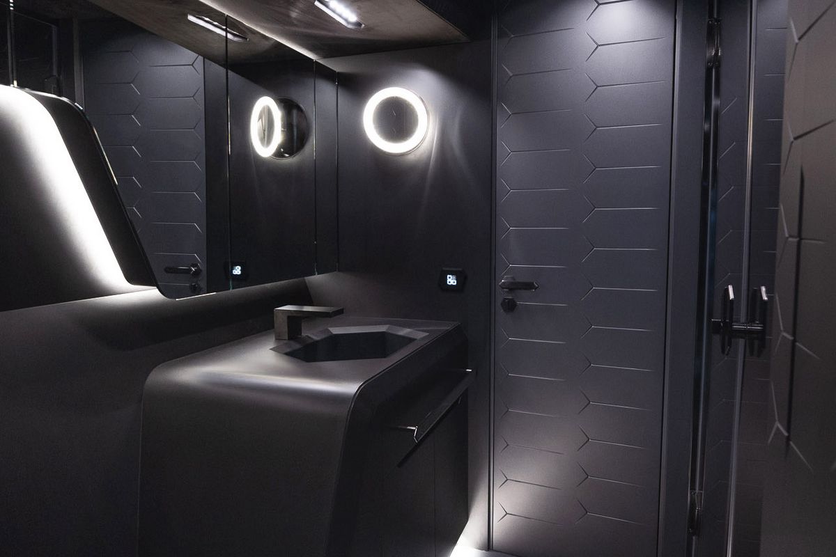 Подпалубное пространство Tecnomar for Lamborghini 63 организовано нетипично для скоростных болидов. Вместо минимализма здесь предусмотрен полноценный камбузный блок, две каюты и очень просторный санузел. Интерьер может показаться мрачным — он напоминает логово Бэтмена, — но к материалам и качеству исполнения вопросов не возникает: всё выглядит дорого и аккуратно собрано.