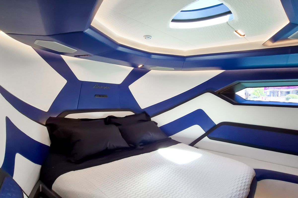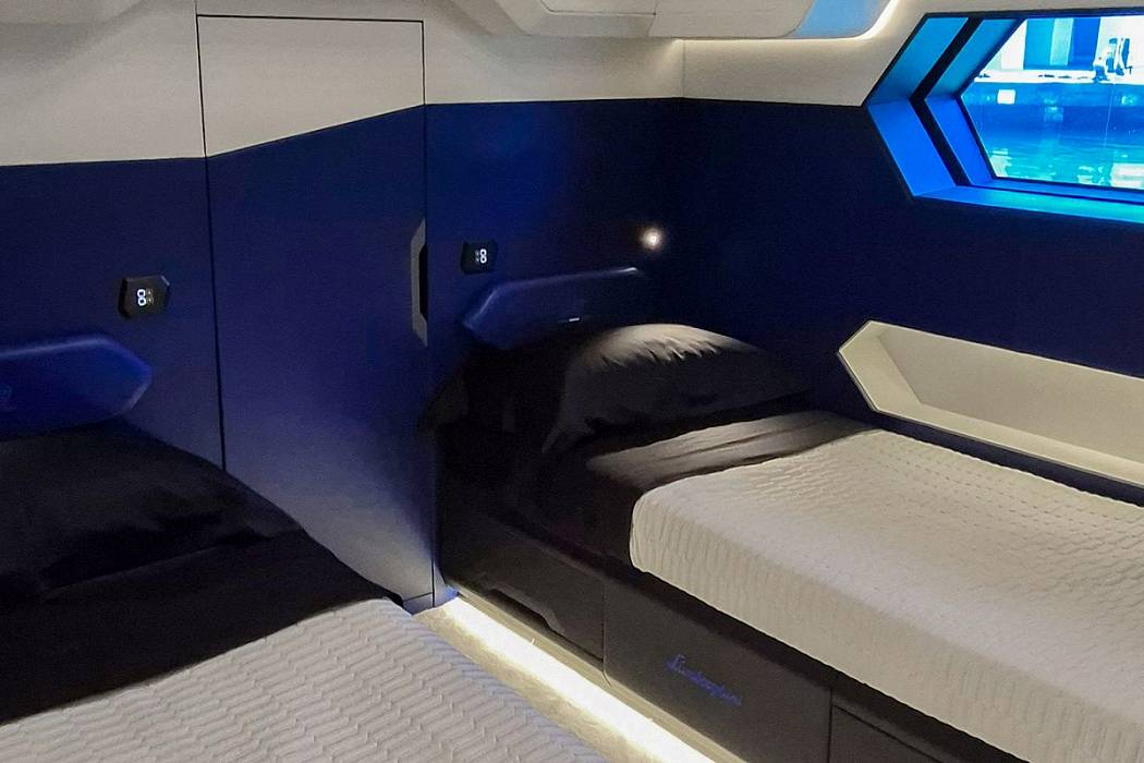 Для эксплуатации с экипажем на борту Tecnomar for Lamborghini 63 предусмотрена отдельная двуспальная каюта с санузлом. Спуск в неё осуществляется вертикально из кокпита, что сохраняет приватность основной жилой зоны.