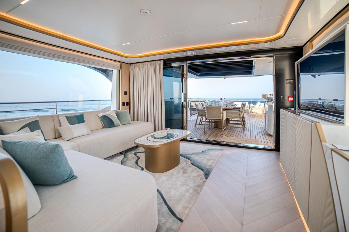 Главным отличием от предыдущей модели Majesty 100 стало переоборудование приподнятой рулевой рубки верхней палубы в скайлаунж. Теперь это пространство включает в себя санузел и большое ветровое стекло для лучшего обзора и комфорта в тени. Скрытая якорная система обеспечивает элегантный внешний вид яхты и беспрепятственный обзор.