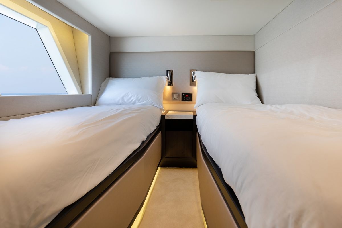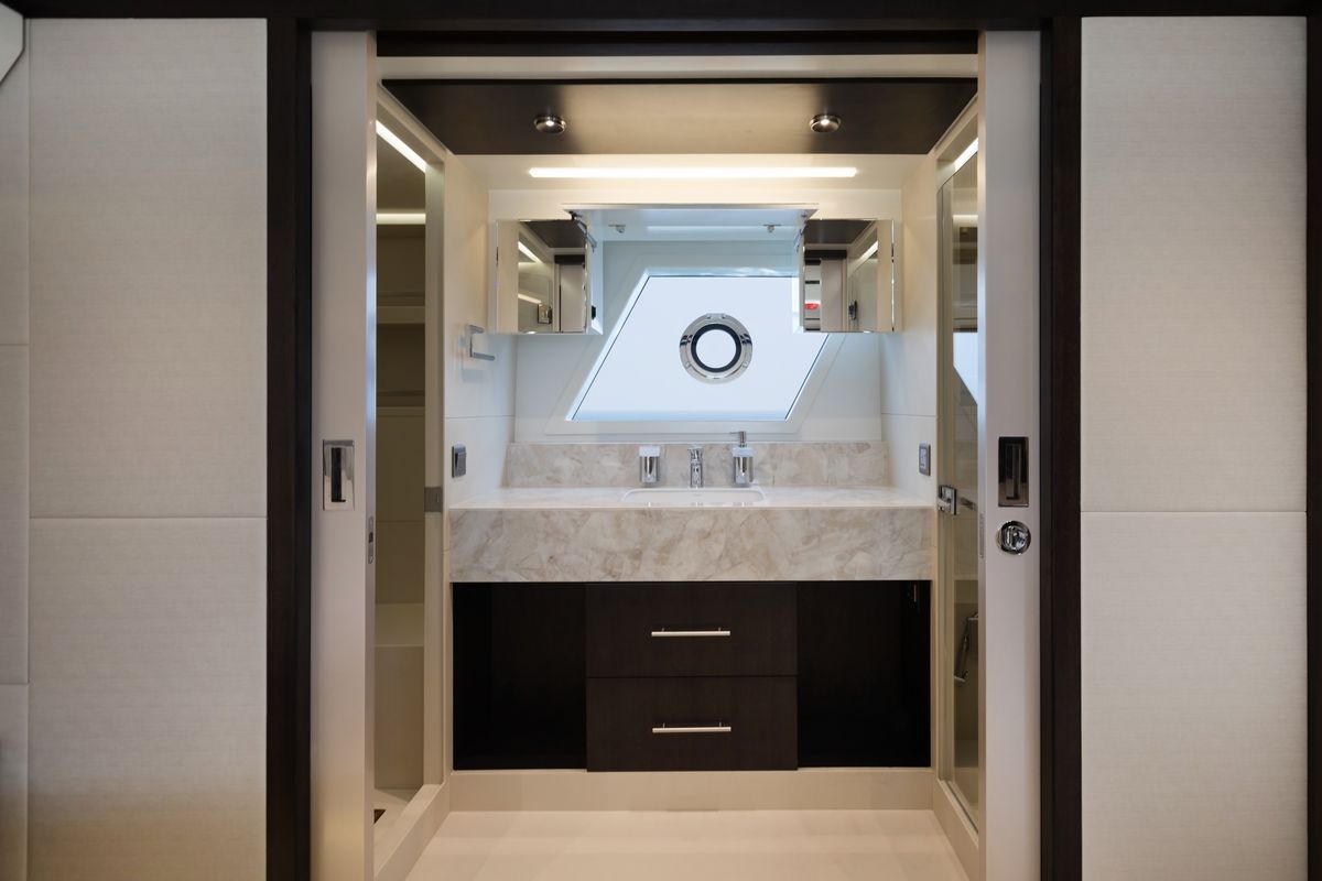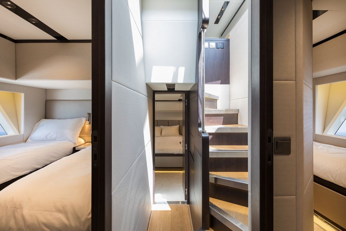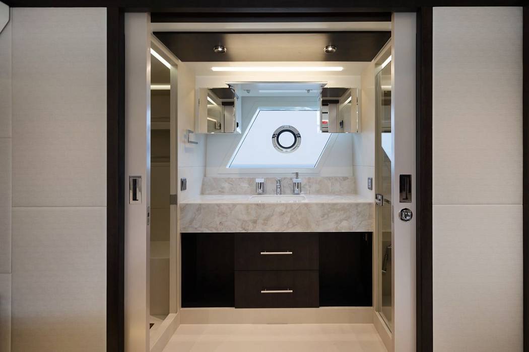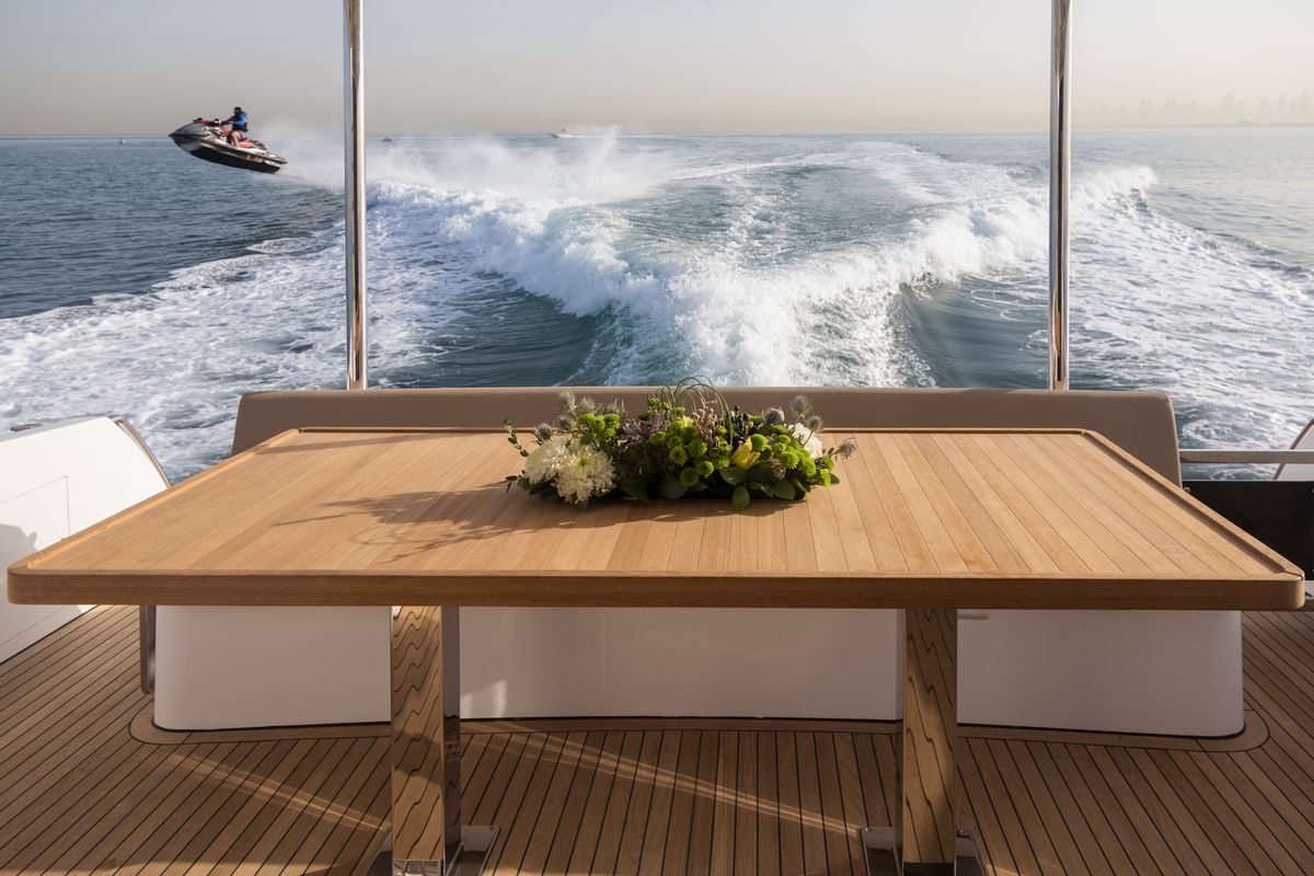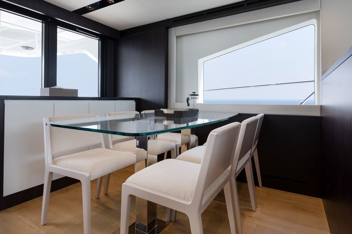 Флайбридж предлагает несколько обеденных зон и огромный лежак для принятия солнечных ванн. В носовой части расположен лежак для загара и зона отдыха.