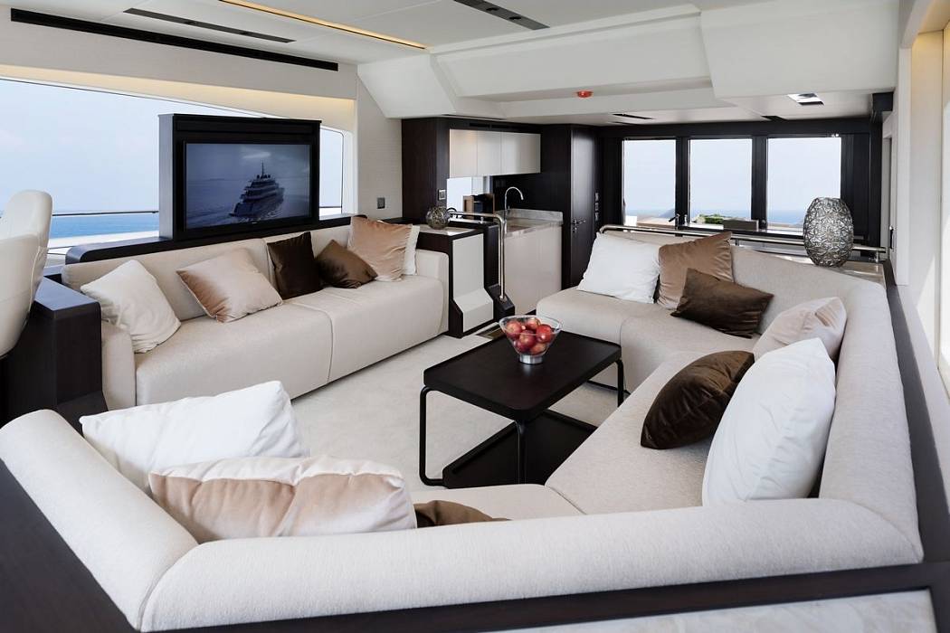 В главном салоне с панорамным остеклением можно найти большую обеденную зону с камбузом и не менее большую диванную зону.