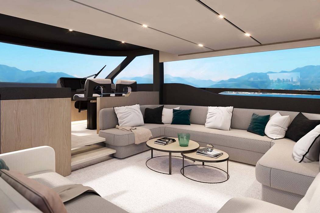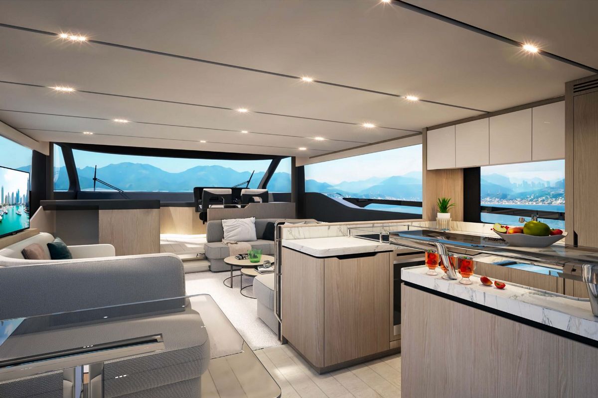 В кокпите гостей ждет просторная обеденная зона, затененная флайбриджем. Далее мы попадаем в салон, разделенный на две зоны: первая - это камбуз и обеденный уголок, и вторая - уютная зона отдыха с ТВ и столиками.