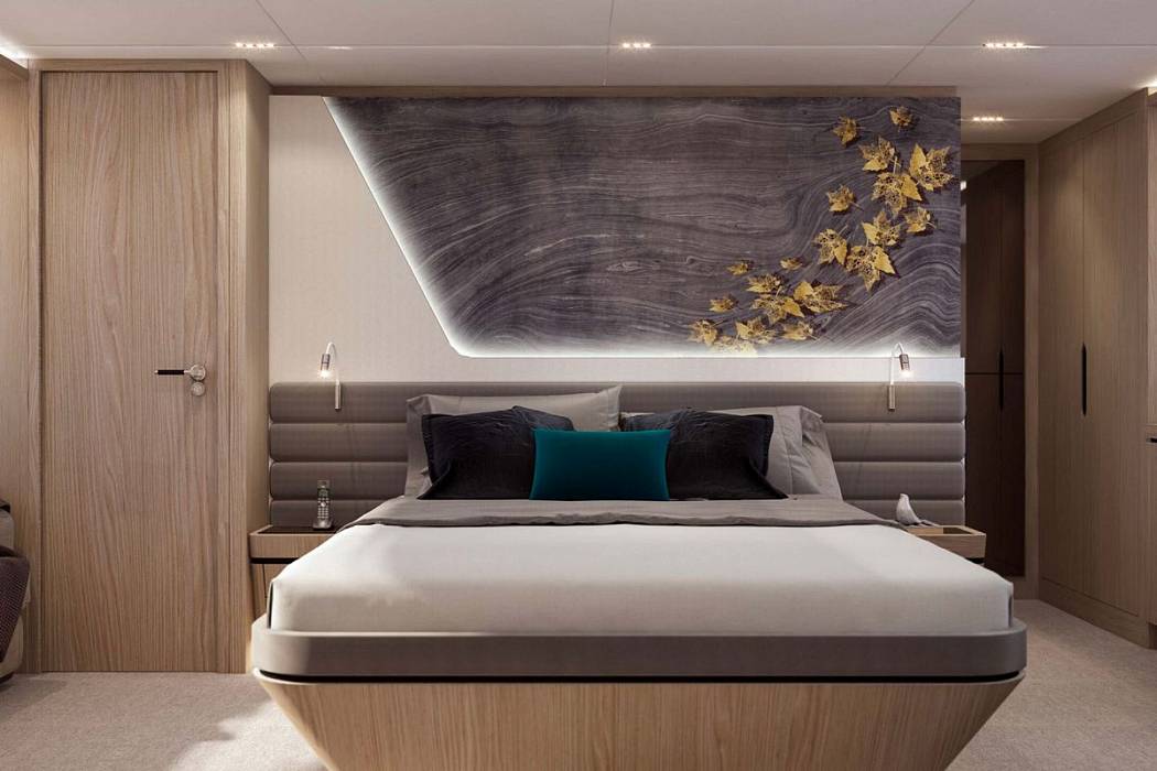 В 4 каютах с роскошным интерьером на нижней палубе могут разместиться 8 гостей. Мастер-каюта во всю ширину лодки c гардеробной и собственной ванной комнатой. VIP-каюта с большой двуспальной кроватью также оборудована собственным санузлом. По правому и левому бортам расположены две твин-каюты. Имеются спальные места для двух членов экипажа.