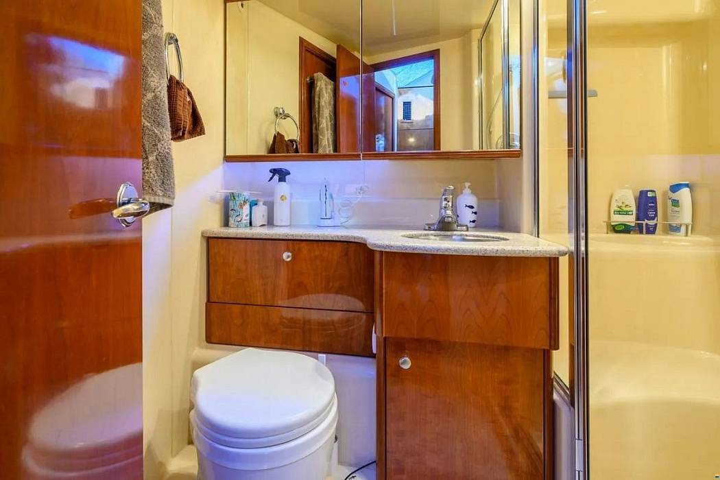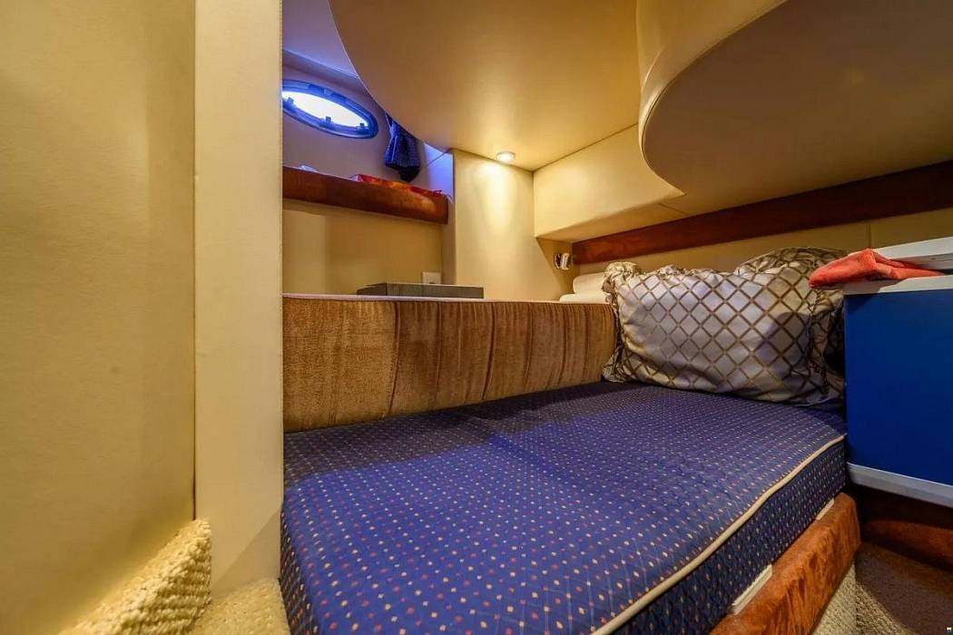 В носовой части находится мастер каюта на двоих с отдельным входом в санузел. Санузел имеет второй вход из коридора и выделяется очень просторной душевой кабиной — для 35 футов это редкость. Гостевая каюта выполнена в виде двуспальной подпалубной, с хорошей площадью и приемлемой высотой.