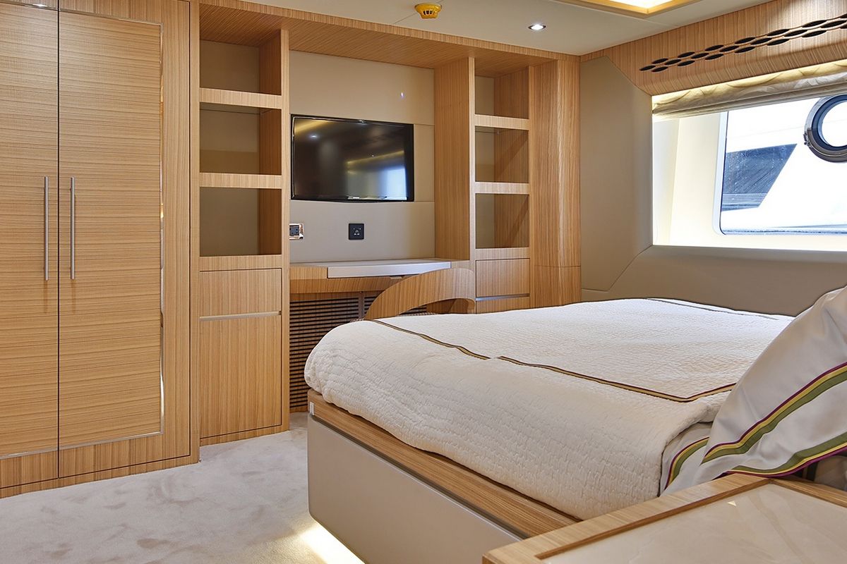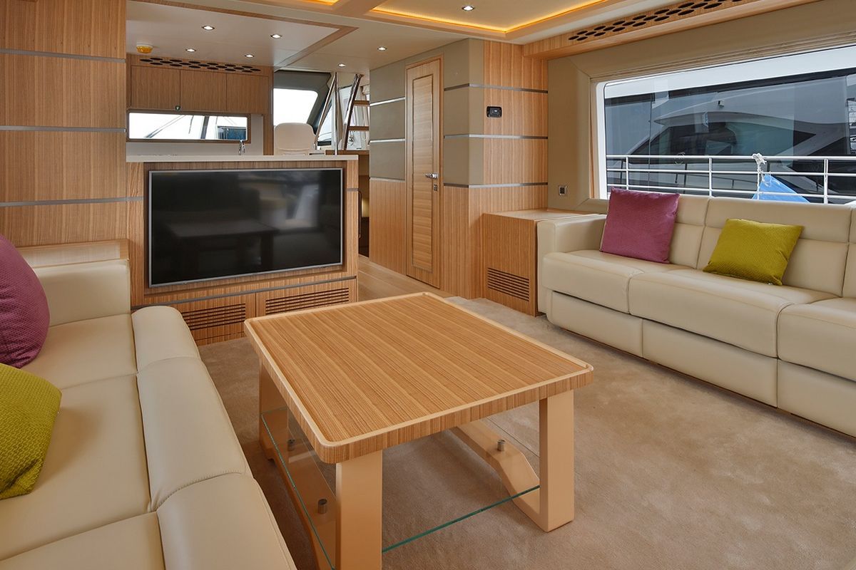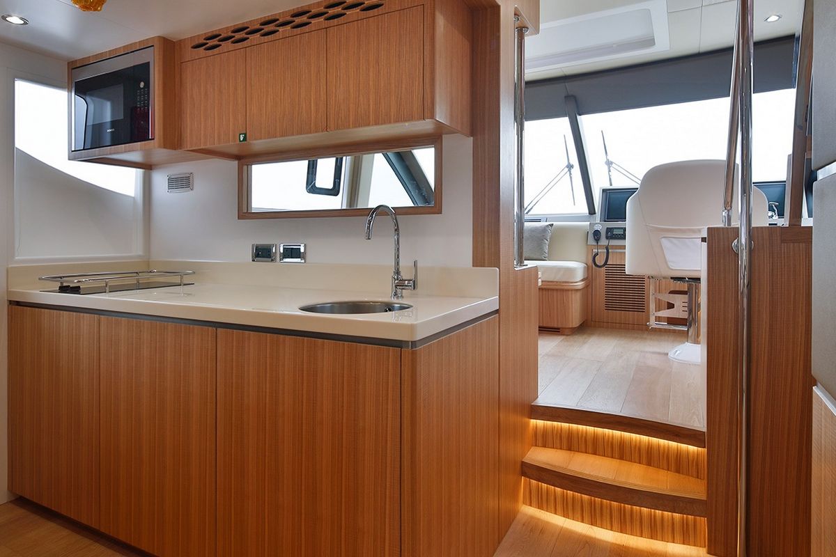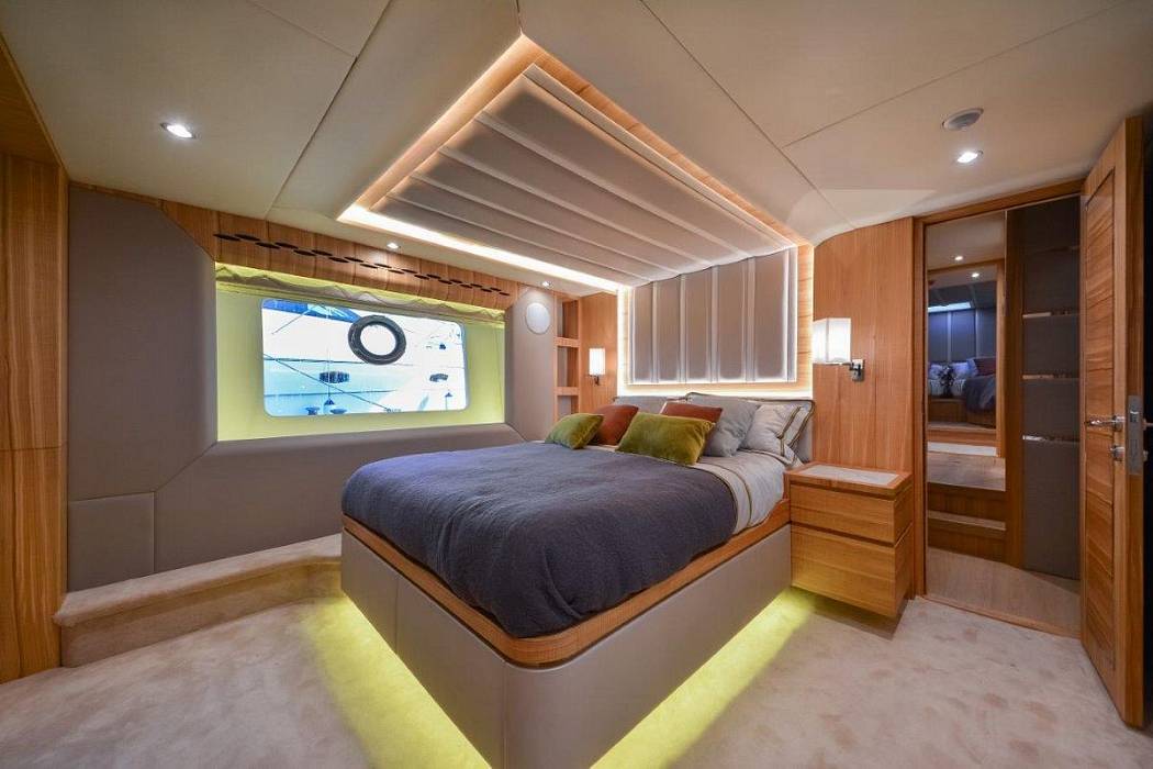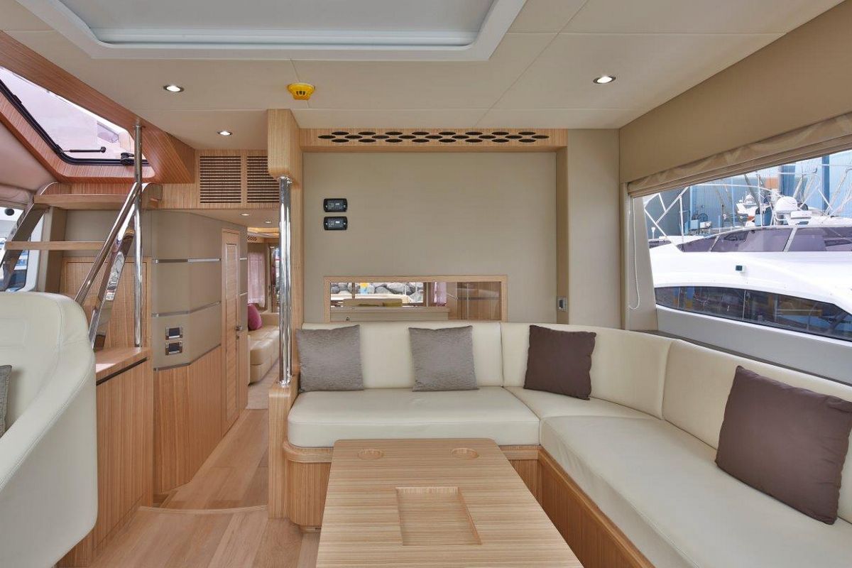 Продуманное расположение площади остекления в салоне позволяет естественному свету проникать внутрь. В салоне можно найти просторную зону отдыха, полноценный камбуз и обеденную зону. Мастер каюта на нижней палубе оборудована собственной ванной комнатой и всем необходимым для длительного комфортного отдыха.