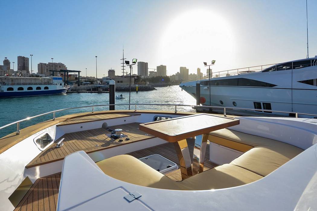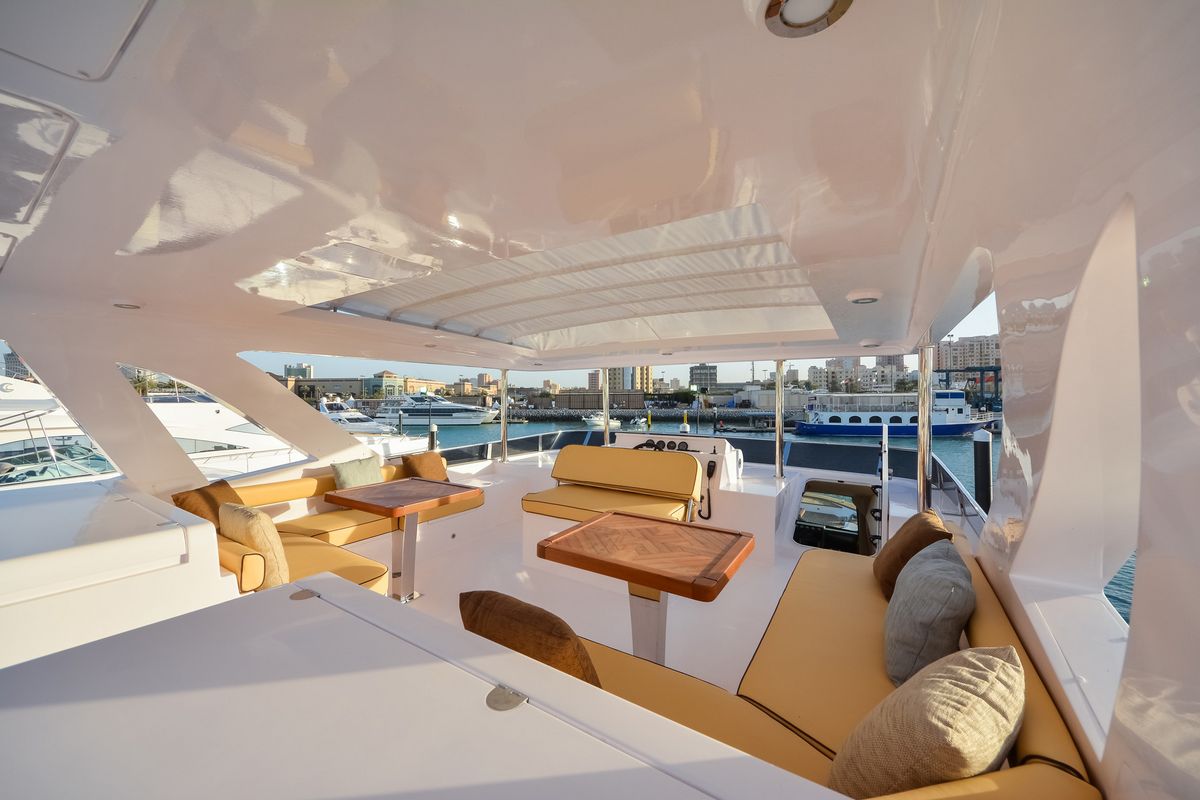 Кокпит встречает гостей уютной зоной отдыха с большим столом, на носу яхты расположена еще одна зона отдыха. На флайбридже гости смогут отдохнуть в затененной лаунж зоне или же позагорать на лежаках.