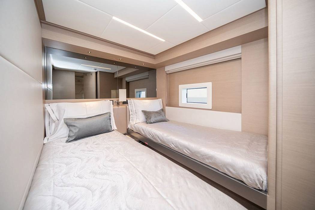 На борту также предусмотрено две полностью отдельные каюты для экипажа на 4 человека, что невероятно для 23-метровой лодки!
