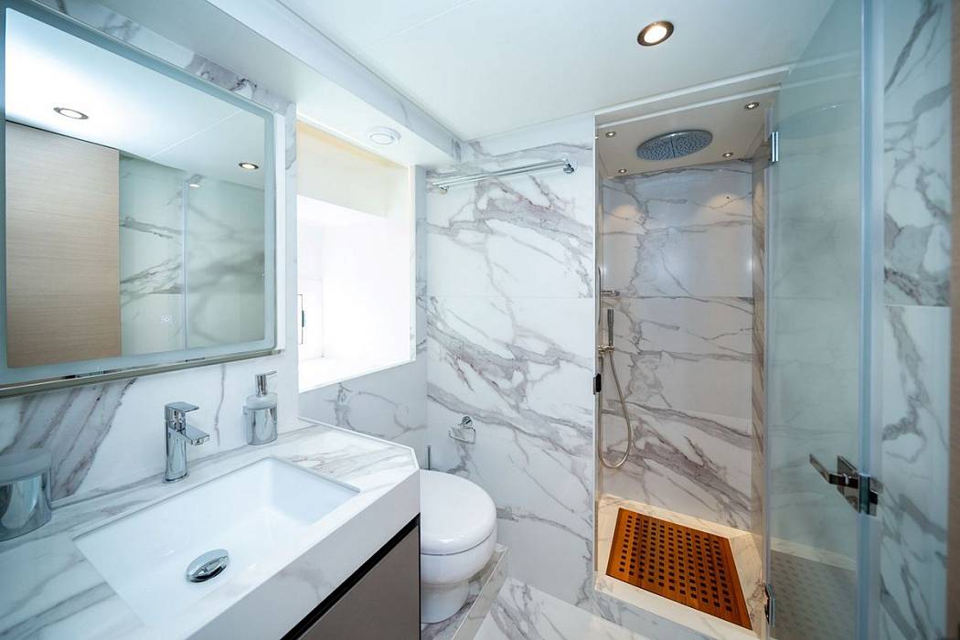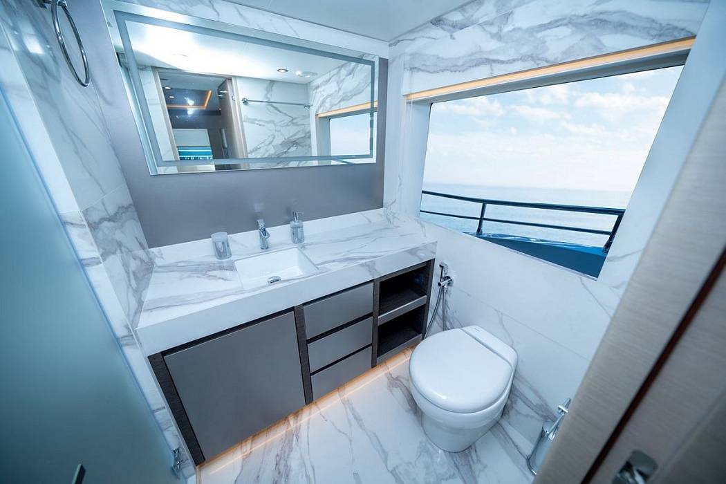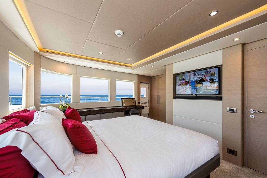 Мастер-каюта расположена на главной палубе и открывает владельцу панорамный вид благодаря впечатляющей площади остекления. Полностью закрытая рулевая рубка на второй палубе и скай лаунж на верхней палубе! Стеклянные двери открываются с обеих сторон и объединяют пространство салона и открытой части верхней палубы.