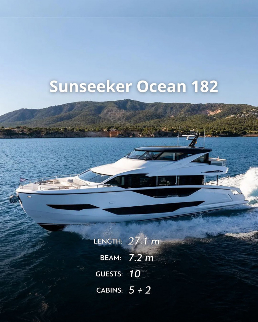 - Sunseeker Ocean 182, 27,1 м — Первая модель Sunseeker с закрытым флайбриджем, что делает её уникальным представителем в своем классе компактных роскошных яхт.