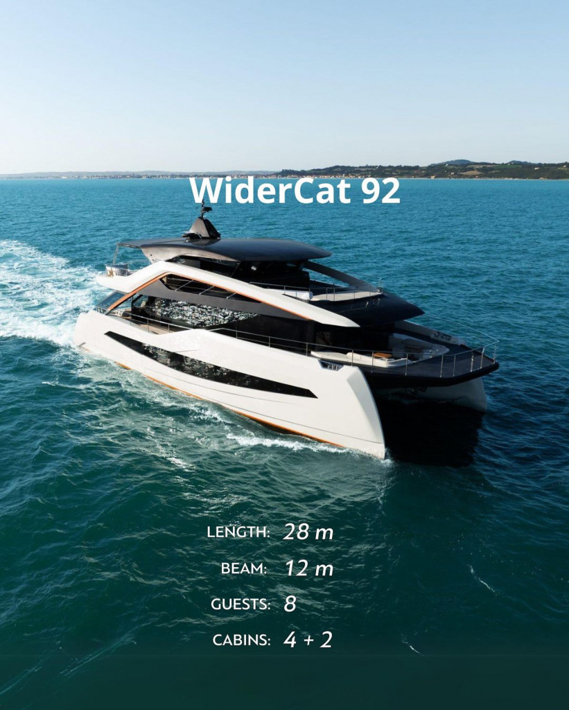 - WiderCat 92, 28 м — Модный катамаран с доставкой в 2024 году. Его гибридная система на солнечных панелях обеспечивает плавный, бесшумный ход и дальность до 2400 морских миль.