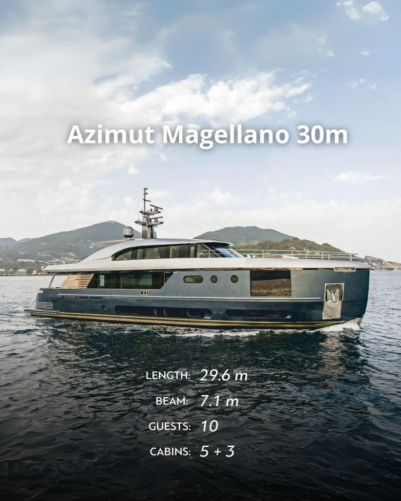 - Azimut Magellano 30M, 29,6 м — Верхняя палуба с баром и зоной для ужина на свежем воздухе, а стеклянные перила открывают свободный обзор, сохраняя при этом безопасное ограждение.