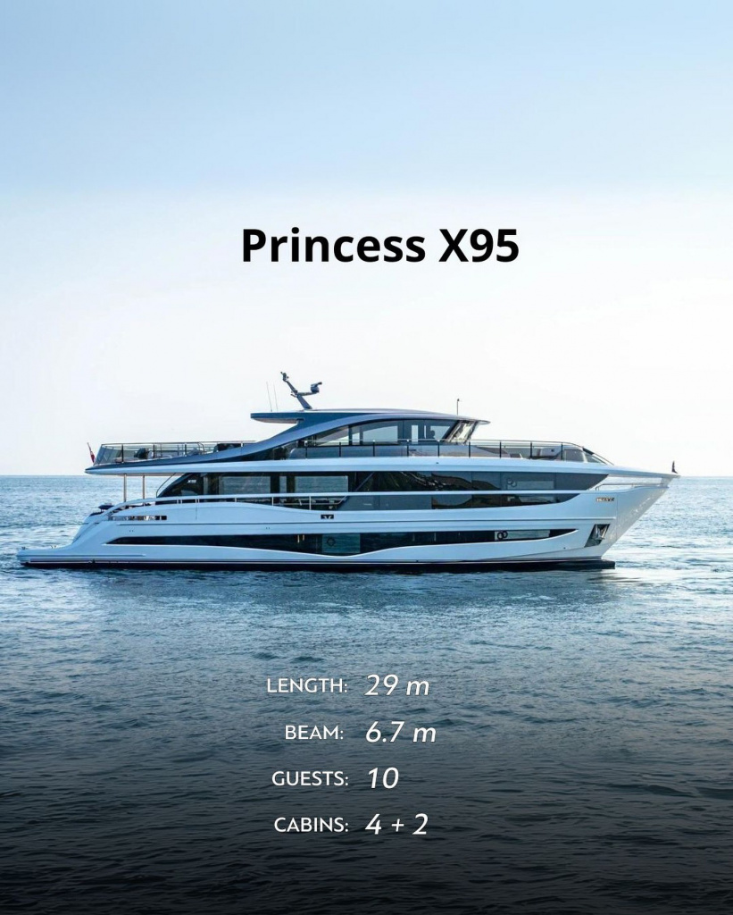 - Princess X95, 29 м — Закрытый, кондиционируемый скай лаунж и зона для обедов на свежем воздухе — идеально в любой сезон. Есть возможность установить джакузи.