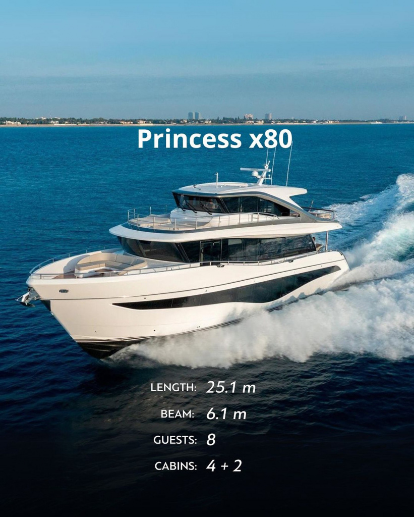 - Princess X80, 25,1 м — Супер-флайбридж, который на 30% увеличивает полезную площадь внутренних помещений в сравнении с традиционными моделями.