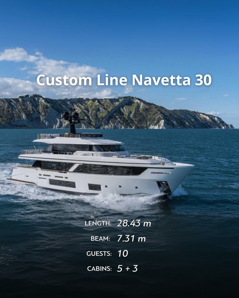 - Custom Line Navetta 30, 28,4 м — Верхняя палуба площадью 37 кв.м объединяет лаунж-зону на открытом воздухе и закрытый салон, что позволяет насладиться открытым пространством в защищенной обстановке.