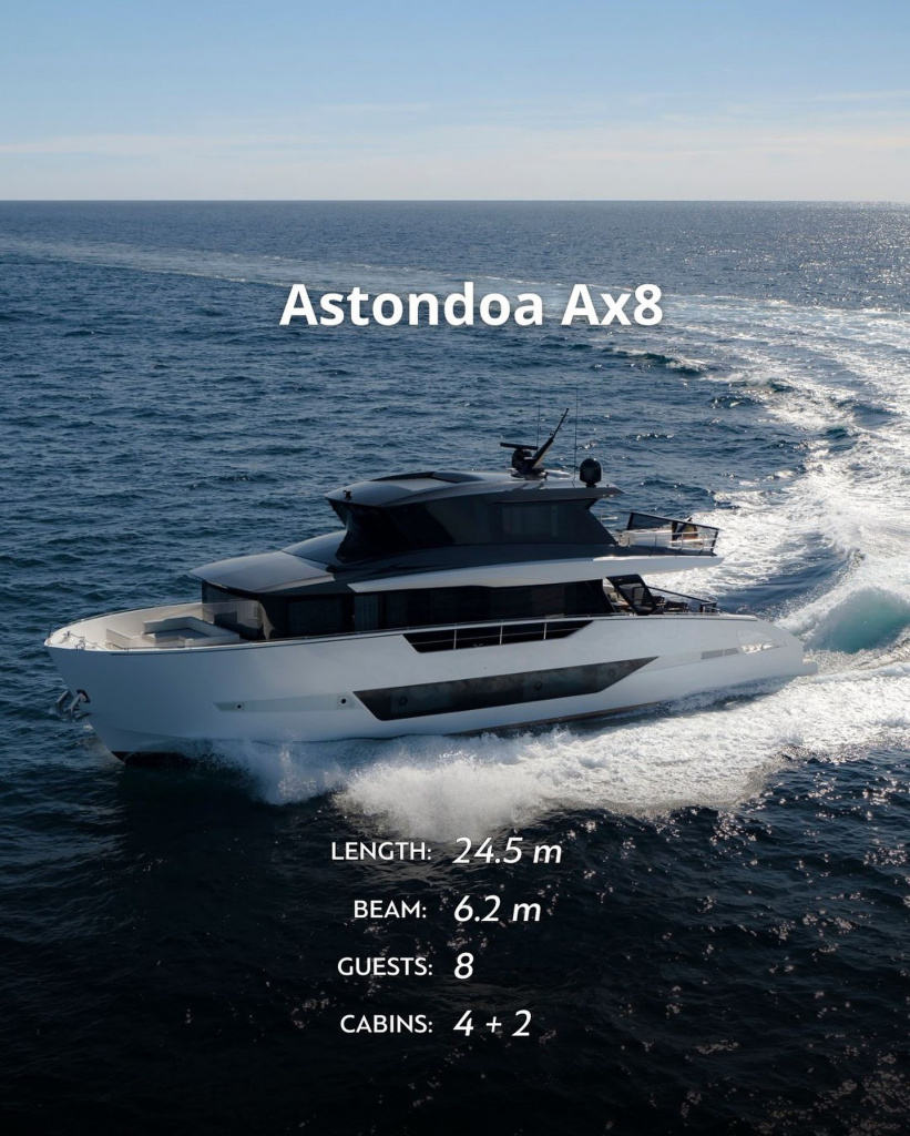 - Astondoa Ax8, 24,5 м — Верхняя палуба с гибкой планировкой, позволяющей отделить или объединить зоны поста управления и салона.